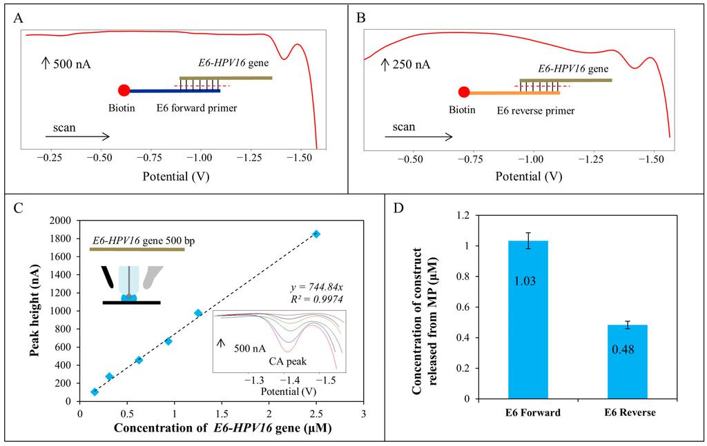 The second part of this work is based on the electrochemical detection of E6-HPV16 DNA after being released from the different magnetic nanoconstructs. There are many other studies about electrochemical biosensors for HPV DNA detection. Wide range of electrochemical techniques has been used for this aim such as DPV, SWV, AdTS SWV, CV, etc. [,,,,,,,,].
