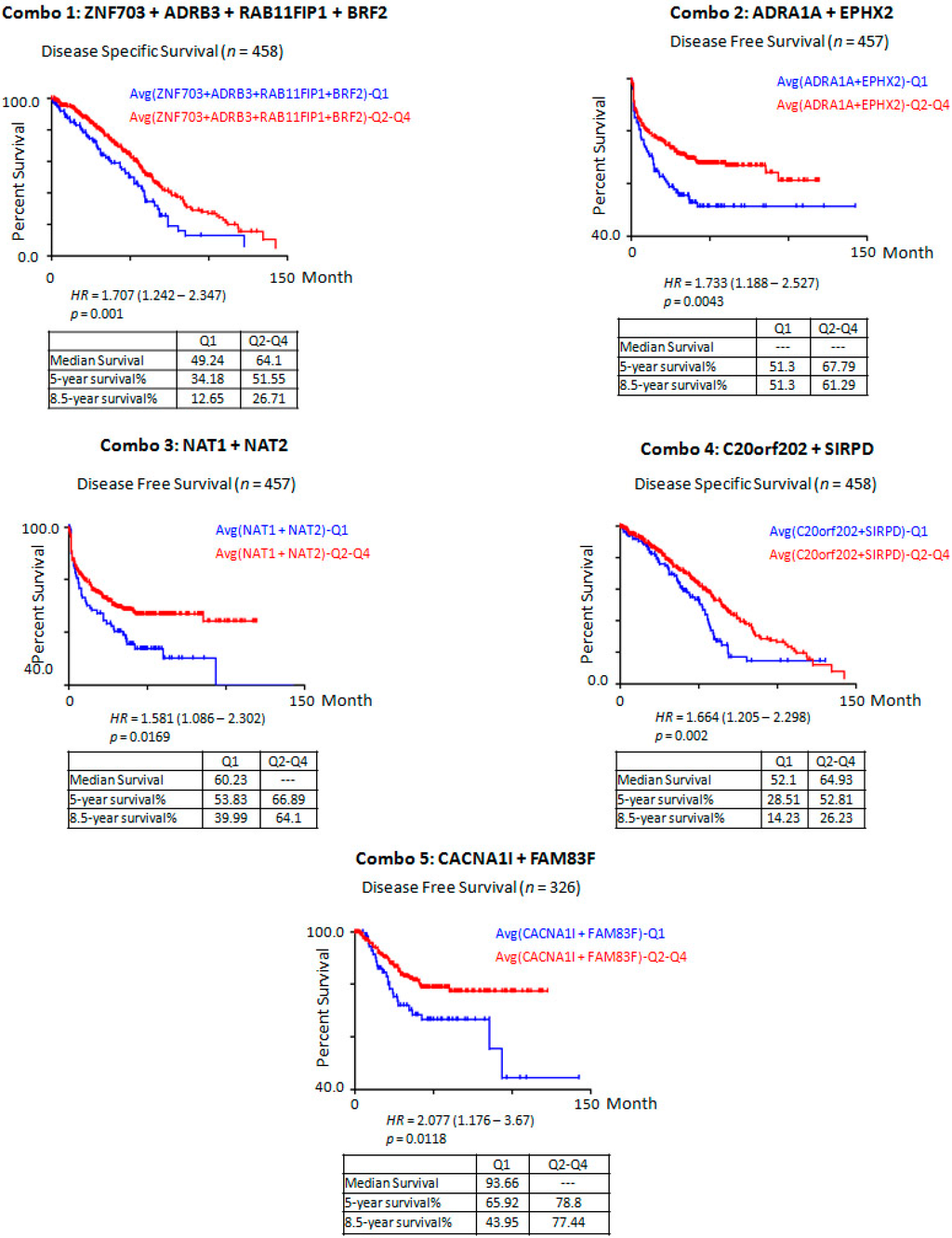 Five different combinations (Combo 1-5) of candidate tumor suppressor genes consistently consolidated their association with disease specific survival (OS), and disease free survival (DFS) in CRC samples’ expression data. Q1–Q4 signify expression quartiles with Q1 being the lowest and Q4 the highest expression quartile.