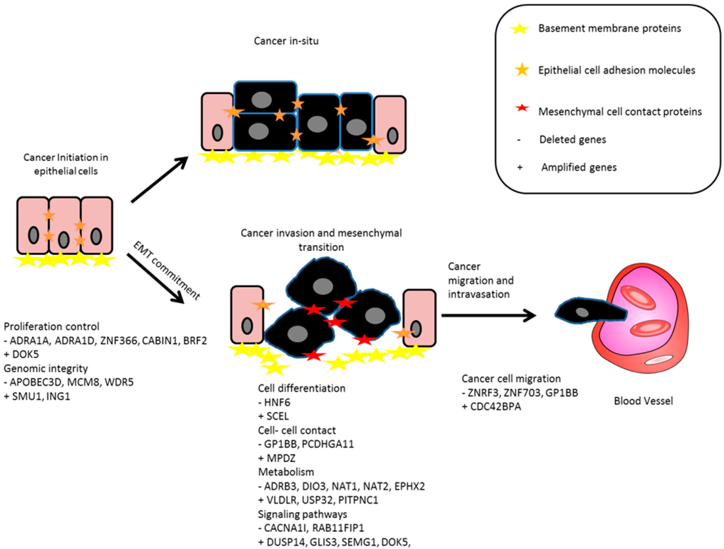 Proposed simple diagram depicting the functional involvement of signature genes in cancer progression, EMT, invasion, and metastasis. The arrows indicate the transition and progression of tumor cells from one stage into the next.