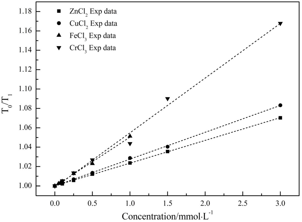 T1 can reflect the process of energy exchange between excited atoms and surroundings, in other words, the smaller T1 means the stronger bounds between target atoms and surroundings within the system. T0 is the spin-lattice relaxation time of pure water. The T1 of ZnCl2, CuCl2, FeCl3 and CrCl3 aqueous solutions at different concentrations were shown Figure 1. From Figure 1, we can see that the T0/T1 of the four electrolyte solutions increased with concentrations in a linear fashion, which is in accordance with the observations from Engel and Hertz [21].