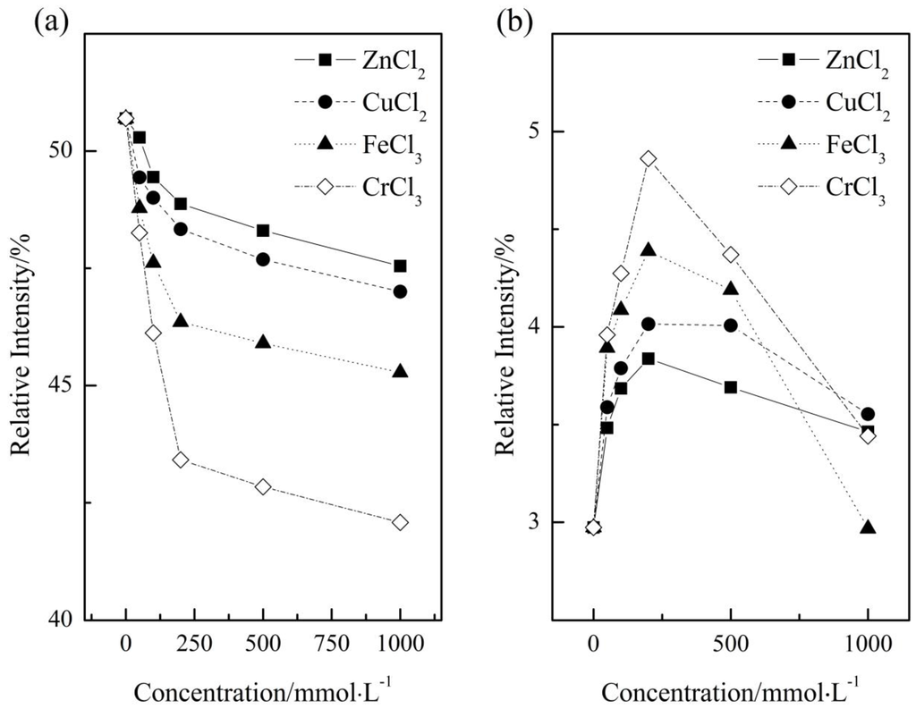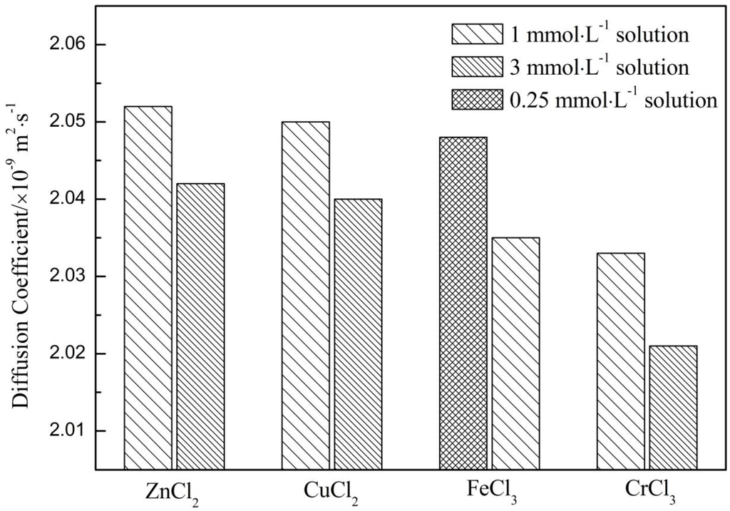 Moreover, according to Figure 2, the diffusion coefficients of 1 mmol·L−1 metal ion solution followed the order: D(H2O) > D(ZnCl2) > D(CuCl2) > D(FeCl3) > D(CrCl3) > D(D2O). That is to say, the ability in enhancing association degree of water decrease in the order of Cr3+ > Fe3+ > Cu2+ > Zn2+. Not only that, the BNMR for the four electrolytes also followed the order: Cr3+ > Fe3+ > Cu2+ > Zn2+ (see Section 2.1.1). The identical order of D and BNMR indicated that the NMR is suitable for manifesting the metal ion-induced effect on water structure. The concrete reason for the difference in changing water structure would be discussed by combining viscosity and Raman results.