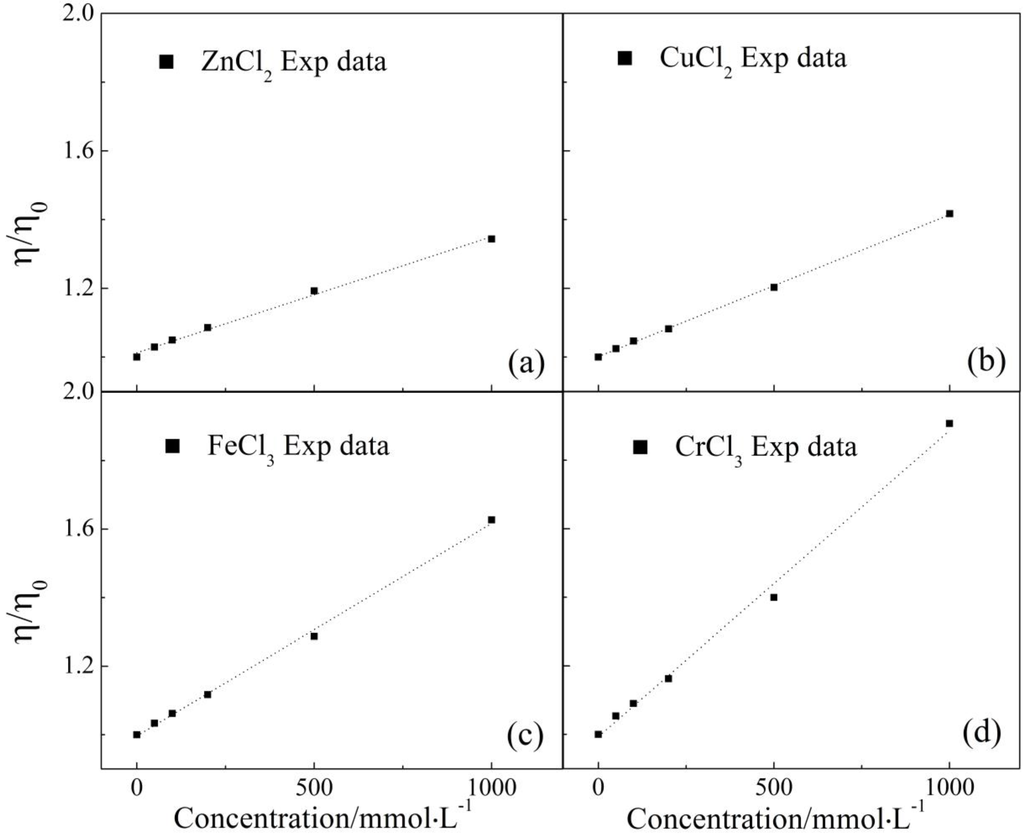 Besides concentration, ionic species is another factor affecting solution viscosity as indicated by Bvis (see Table 1). Cr(III) had the largest Bvis, the second was Fe(III) followed by Cu(II), and Zn(II) bore the smallest Bvis. Thus, the ability in increasing association degree decreased in the order of Cr3+ > Fe3+ > Cu2+ > Zn2+. Furthermore, according to the Einstein equation [35], the size of the ionic cluster could be compared by using the specific viscosity of the four aqueous solutions with the same concentration. As a result, we found that Cr(III) was characterized by the largest effective radius, the second was Fe(III), and Cu(II) and Zn(II) had the third largest and the smallest effective radius, respectively. This order is identical to that of Bvis, and those of D and BNMR from NMR measurements, which proved that the four metal ions chosen here can enhance association degree of local water cluster with some regularities.