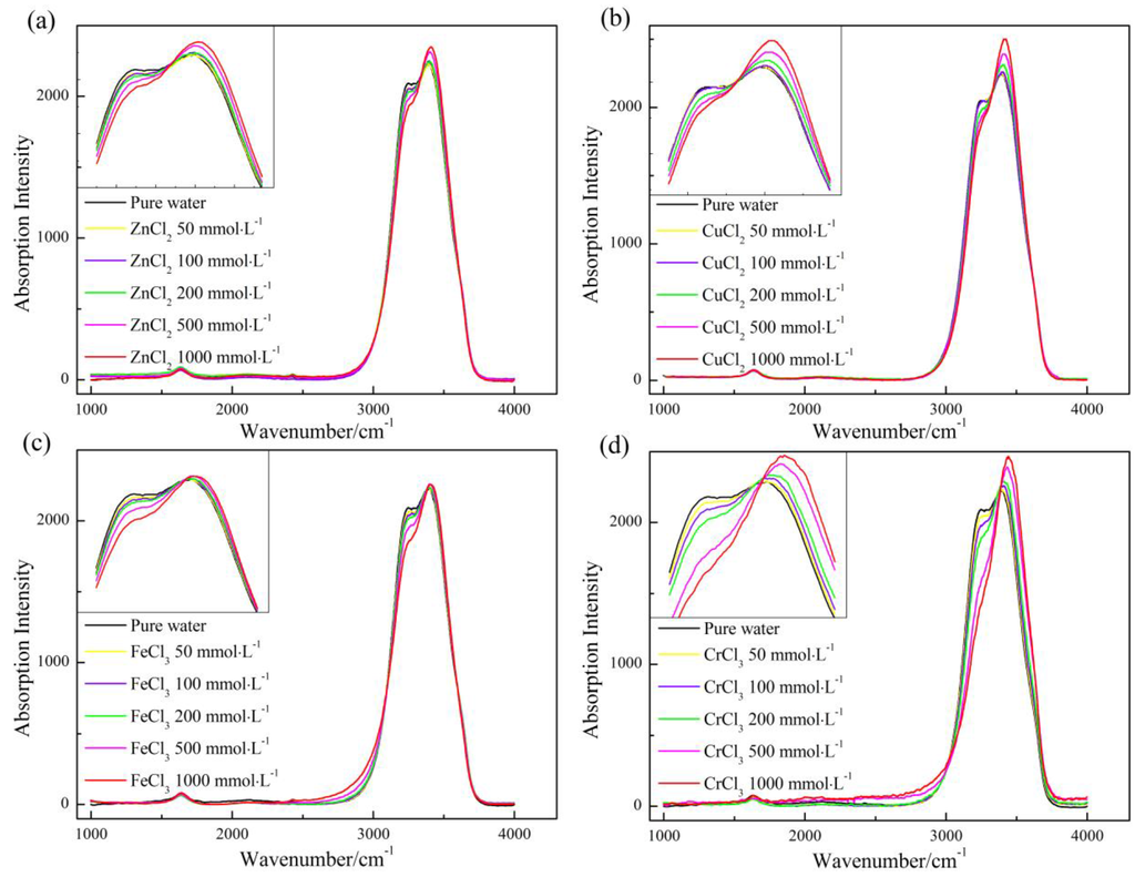 According to the four equations, the BNMR were all larger than zero, which means the association degree of the aqueous solutions on average are higher than that of pure water due to the addition of four electrolytes. Importantly, it has been reported that Cl− has negligible effect on water hydrogen bond network [22,23], so the difference in association degree between aqueous solution and pure water is due mainly to the metal ions appearing in the solution. Considering that there are no other additives except for metal chloride in all sample solutions, the discussion on structural changes in the following parts would just be proceeded based on the differences in dissolved metal ions.