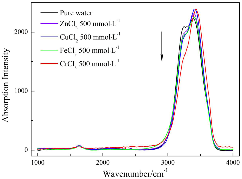 Moreover, the impact on water structure is ion-specific as shown in Figure 5. Concretely, the high association water and low association water were characterized by the largest amplitude of variation upon CrCl3 addition, and FeCl3 and CuCl2 were in the second and third place, respectively, and ZnCl2 had the minimum effect on the amount of the two species. To compare the influence induced by the four electrolytes, we plotted the normalized Raman spectrum of pure water and four aqueous solutions with the same concentrations (500 mmol·L−1) in Figure 6. From Figure 6, one can see a main peak and a shoulder peak centered at the lower wavenumber for the five solutions, among which, pure water had the strongest shoulder peak, second place was acquired by ZnCl2, CuCl2 and FeCl3 had similar peak intensity, and CrCl3 was characterized by the weakest shoulder peak. This relative position is almost identical to those obtained from other experimental measurements occupied in this article.