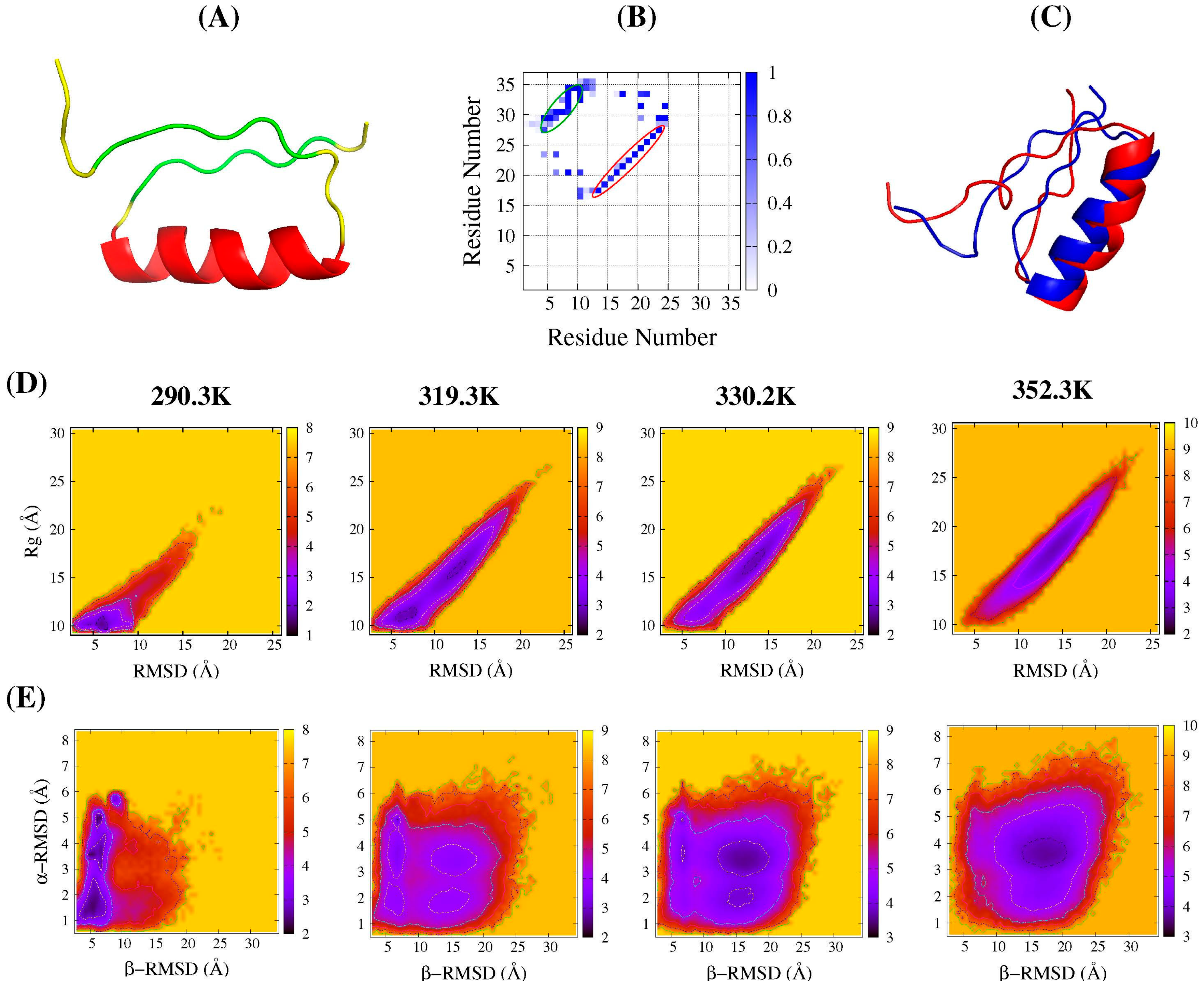 We firstly monitored root-mean-square deviation (RMSD) and the radius of gyration (Rg). The most native-like conformation had a RMSD of 3.08 Å (the aligned structures shown in Figure 1C) at temperature 297.8 K. Figure 1D showed the folding free-energy profiles at four typical temperatures. At near-room temperature (290.3 K), the sampled stable state was located at a RMSD of around 6 Å and a Rg of around 10 Å, and we called it a near-folded state. With the increase of temperature, another minimal region appeared apparently with a larger Rg and RMSD, which implied the occurrence of unfolding. At 319.3 K, the two areas were both observed to be well-populated; until 352.3 K, most of the populated conformations were located in the unfolded region. Therefore, only the near-folded and unfolded states were observed in the Rg-RMSD two-dimensional (2D) profiles. The transition occurred at around 319 K, some lower than that reported in experiments [24].