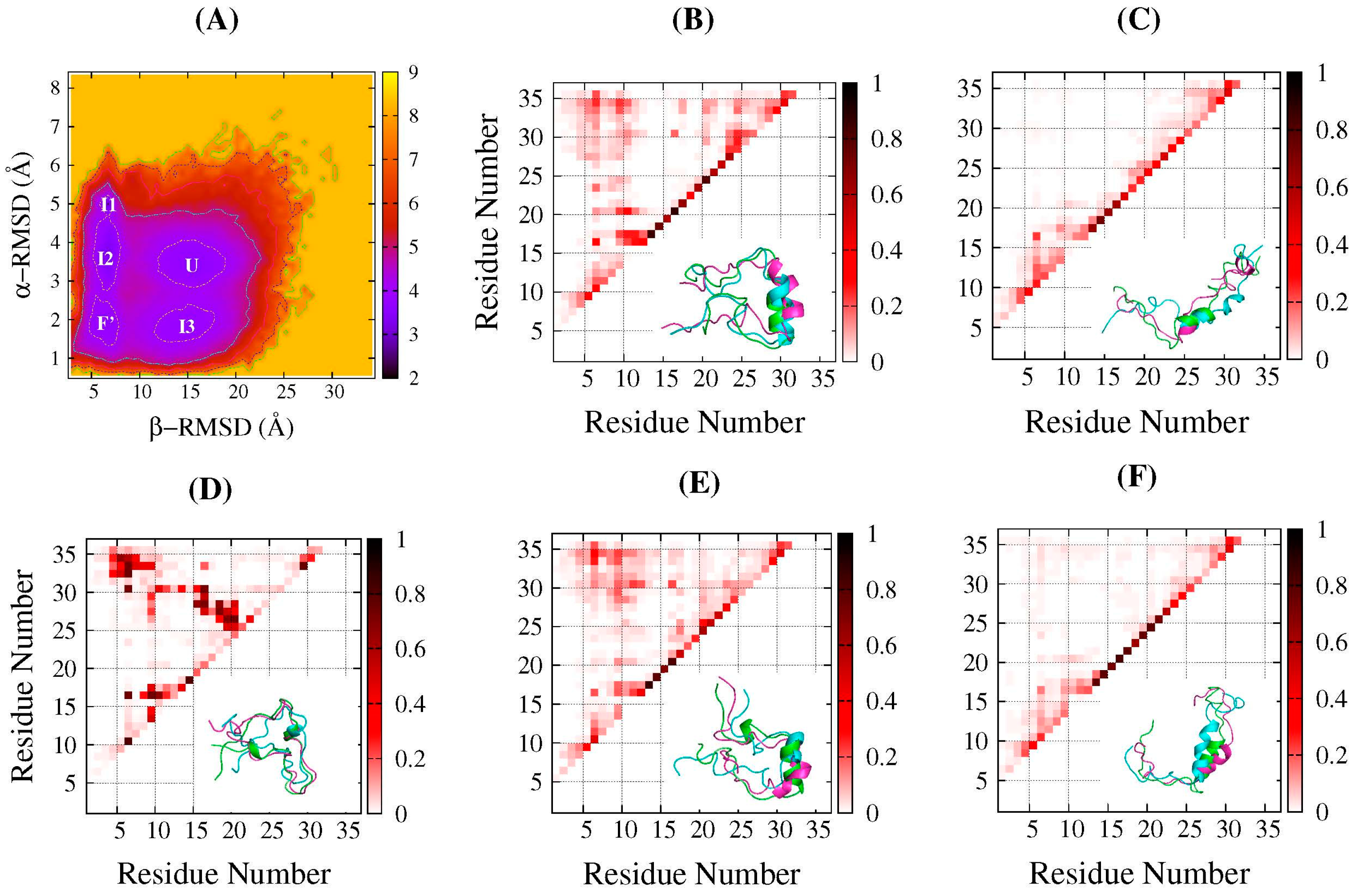 In order to explore the structural features of the intermediate states in more detail, we focused on the folding free-energy landscape based on α-RMSD and β-RMSD at near-transition temperature (319.3 K). We named the five minimal regions as F’ state, U state, and I1, I2, and I3 states respectively marked in Figure 2A. The intra-chain residue contact probability maps, based on at least 100 representative frames sampled in the corresponding regions with a time step interval of at least 100 ps, were presented in the top-left triangular areas in Figure 2B–F. Here, the contact was defined when the distance between the two heavy atoms in each residues was less than 4.5 Å, and the two residues were separated by at least 3 residues along the sequence. Furthermore, three of the sampled frames were selected randomly, and the aligned schematic structures were shown in the bottom-right triangular areas of Figure 2B–F. The F’ state was centered at around (6.0, 1.8 Å), with a smaller β-RMSD and α-RMSD; therefore, it was the most native-like. In Figure 2B, the residues from 14 to 27 showed a higher probability of forming an α-helix, and the aligned schematic structures confirmed that. The points in top-left corner indicated that N- and C-terminals had contacts, and the whole protein collapsed as the Rg reached approximately 10 Å (Figure 1D). The β-sheet was almost not formed, since most of the contacts were nonnative, as the aligned structures shown in Figure 2B indicate. In short, in this native-like state, the main deviation from the native structure occurred on β-sheet segments. The unfolded region U exhibited an extended structural feature, with the β-RMSD at around 15 Å and very low N-C terminal contact probability, as shown in Figure 2C. In this region, some short α-helices could still be identified with an α-RMSD value close to 3~4 Å, but most occurred to the residues 14 to 17, although the location apparently varied. This indicates that, in the unfolded state, the conformations are not completely unstructured.