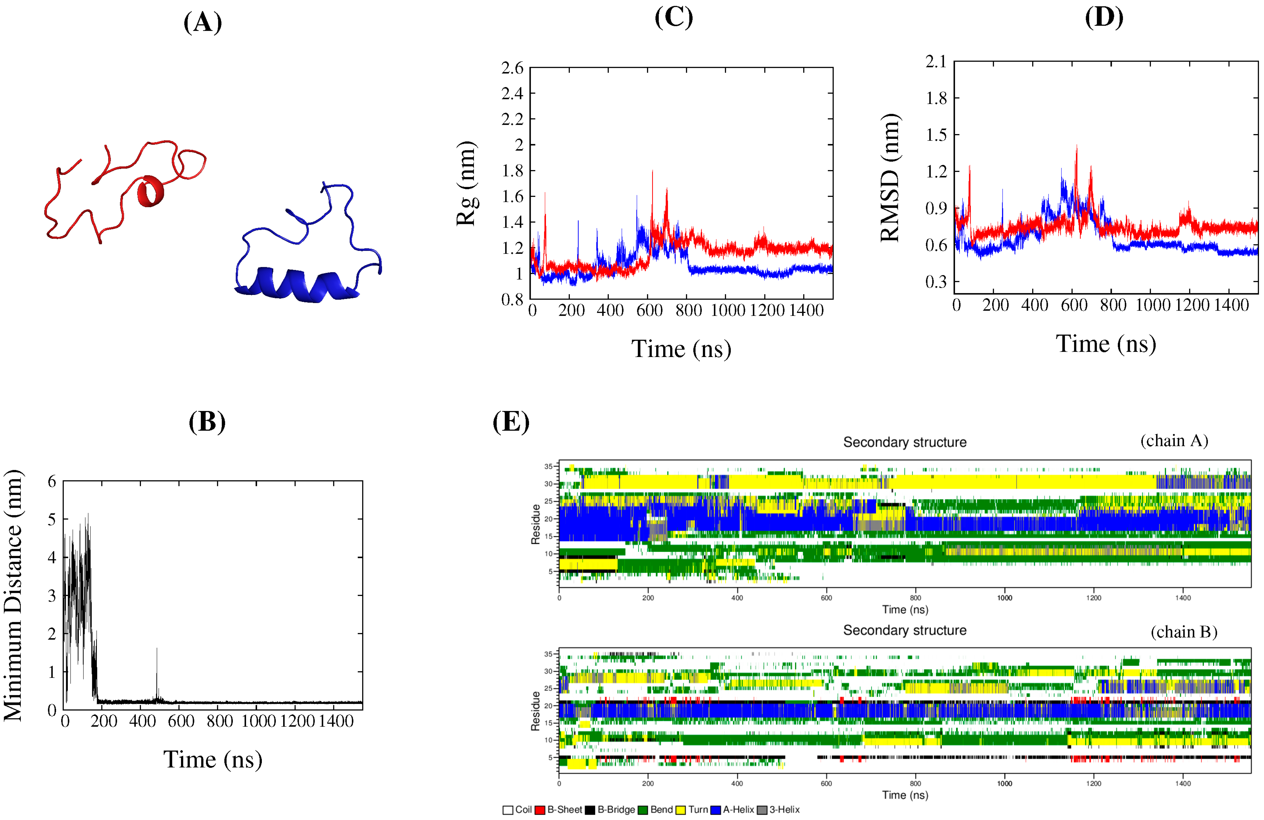Analysis for a representative trajectory (simulation 1) from conventional molecular dynamics (CMD) simulations. (A) Typical initial structure for a dimer aggregation simulation; (B) Minimal distance of the two proteins versus simulation time; (C) Rg values of each protein along with simulation time; (D) RMSD values of each protein along with simulation time; (E) Secondary structure analysis (based on a dictionary of secondary structure of proteins (DSSP)) of two proteins; in (C,D), the blue lines denote chain A, and the red ones denote chain B.
