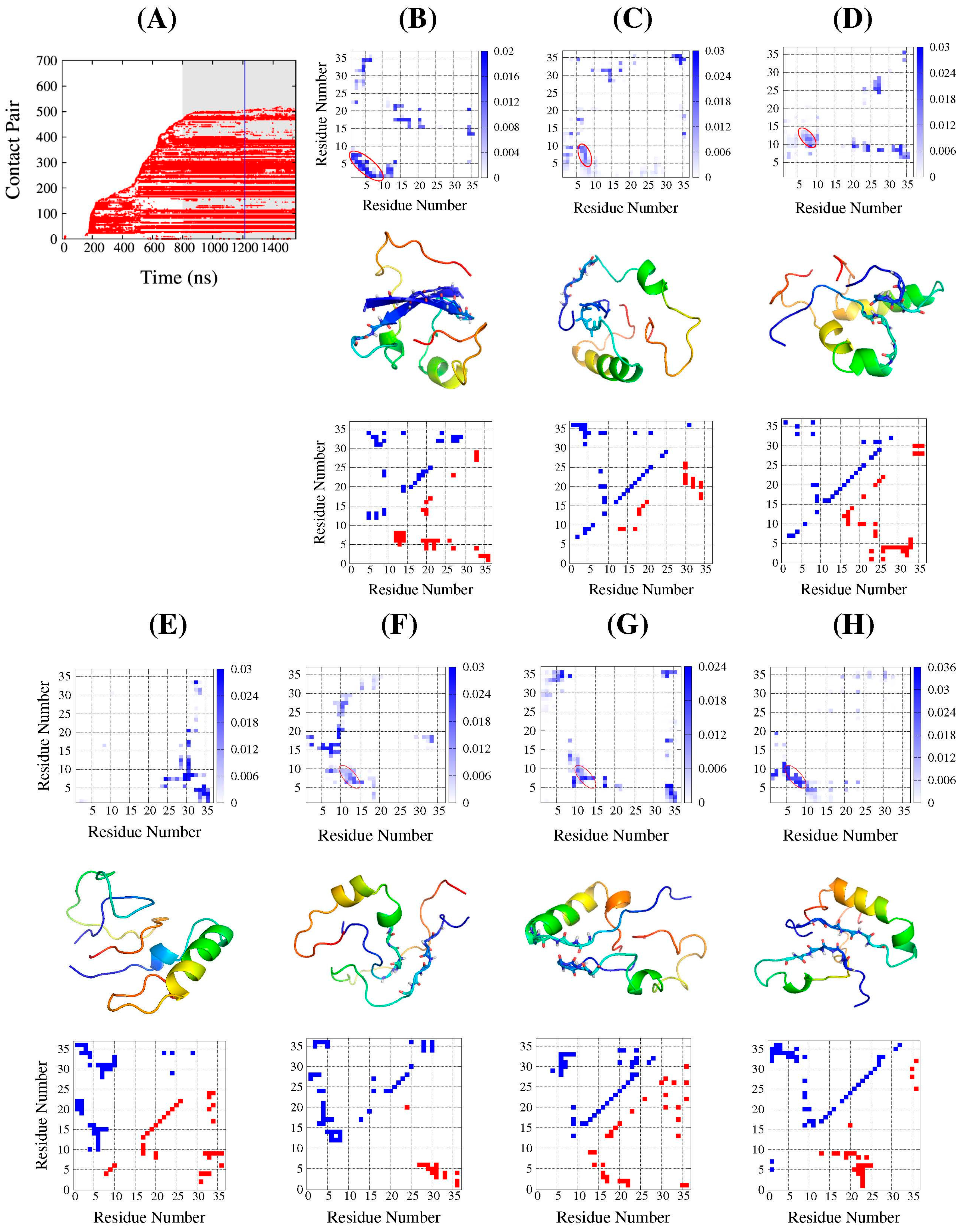 Contact patterns and structural characterization in the initial dimeric aggregates based on CMD simulations. (A) Representative plot of inter-chain residue–residue contact pairs along simulation time (simulation 1). Shadow area denotes the “flat stage” along simulation times. Blue line indicates the simulation time of typical snapshot; (B–H) For seven aggregation simulations: top panels: the inter-chain residue contact frequency map based on shadowed area shown in (A) and Figure S6. The red circles in the top panels of Figure 4B–D and F–H represent the common contact pattern with the N-terminal of one protein (mainly residue 5–10) bonded with the N-terminal residues of the other; Middle panels: typical snapshot illustrations. Gradually changing colors from blue to red represent proteins from N to C terminal, and the sticks of the mainchain correspond to the circle regions on the top panels; Bottom panels: the intra-chain residue contact maps of each protein on the middle panels, with top-left (blue solid squares) and bottom-right triangles (red solid squares) representing chain A and chain B, respectively. To be clear, (B) is for simulation 1, and (C–H) correspond to simulations of (A–F) in Figures S3–S6, respectively.