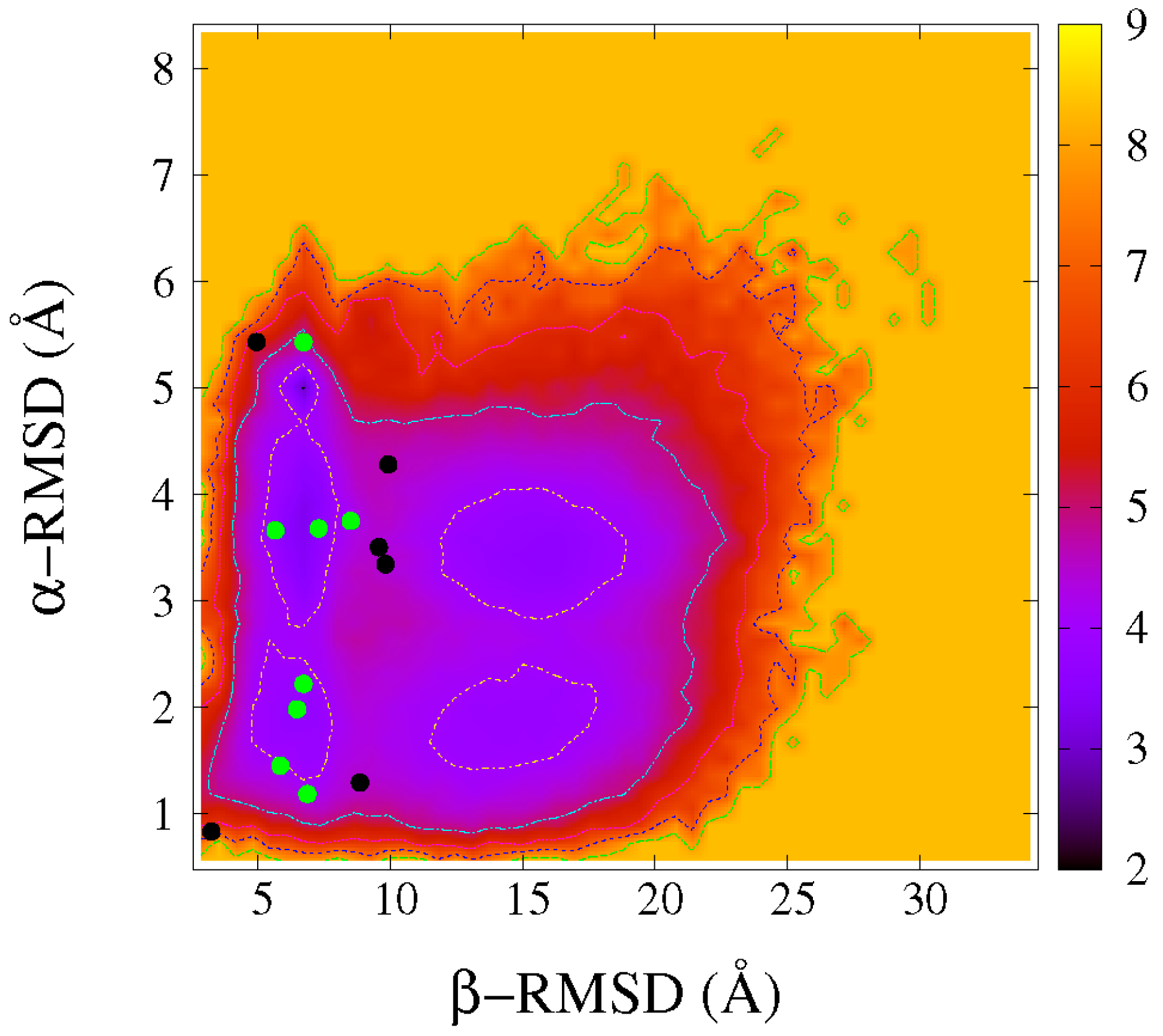 Locations of the typical conformation of monomers from dimeric aggregates on the free-energy landscape in Figure 2A. Green points represent those in or near the minimal regions and black ones represent those that are far from these regions.