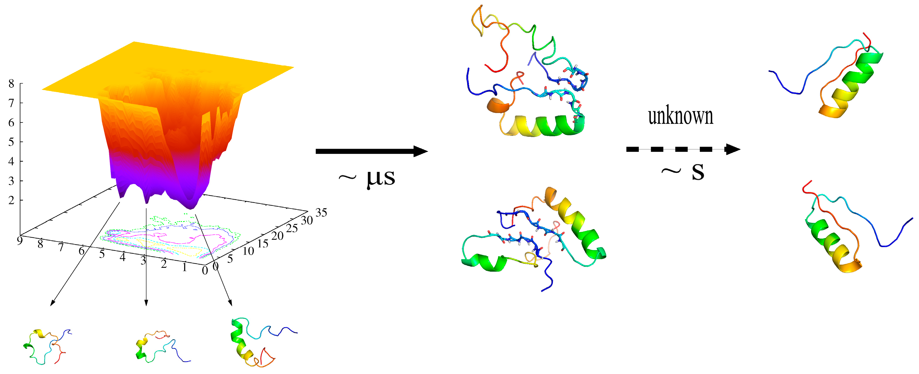 Over several decades of this study, one fundamental feature has been found, namely, that many naturally evolved single-domain proteins fold cooperatively in a two-state-like manner [5,6], which is suggested as serving crucial functions, such as avoiding harmful aggregation, and might be the result of biological evolution [7,8]. More recently, through all-atom molecular dynamics simulations, Shaw and coworkers studied more than 10 relatively small proteins and observed many folding and unfolding transitions in long equilibrium trajectories [9,10], which provided much more atomistic details of folding kinetics and mechanisms. The results indicated that this technique could serve as a powerful tool for elucidating protein folding behavior.