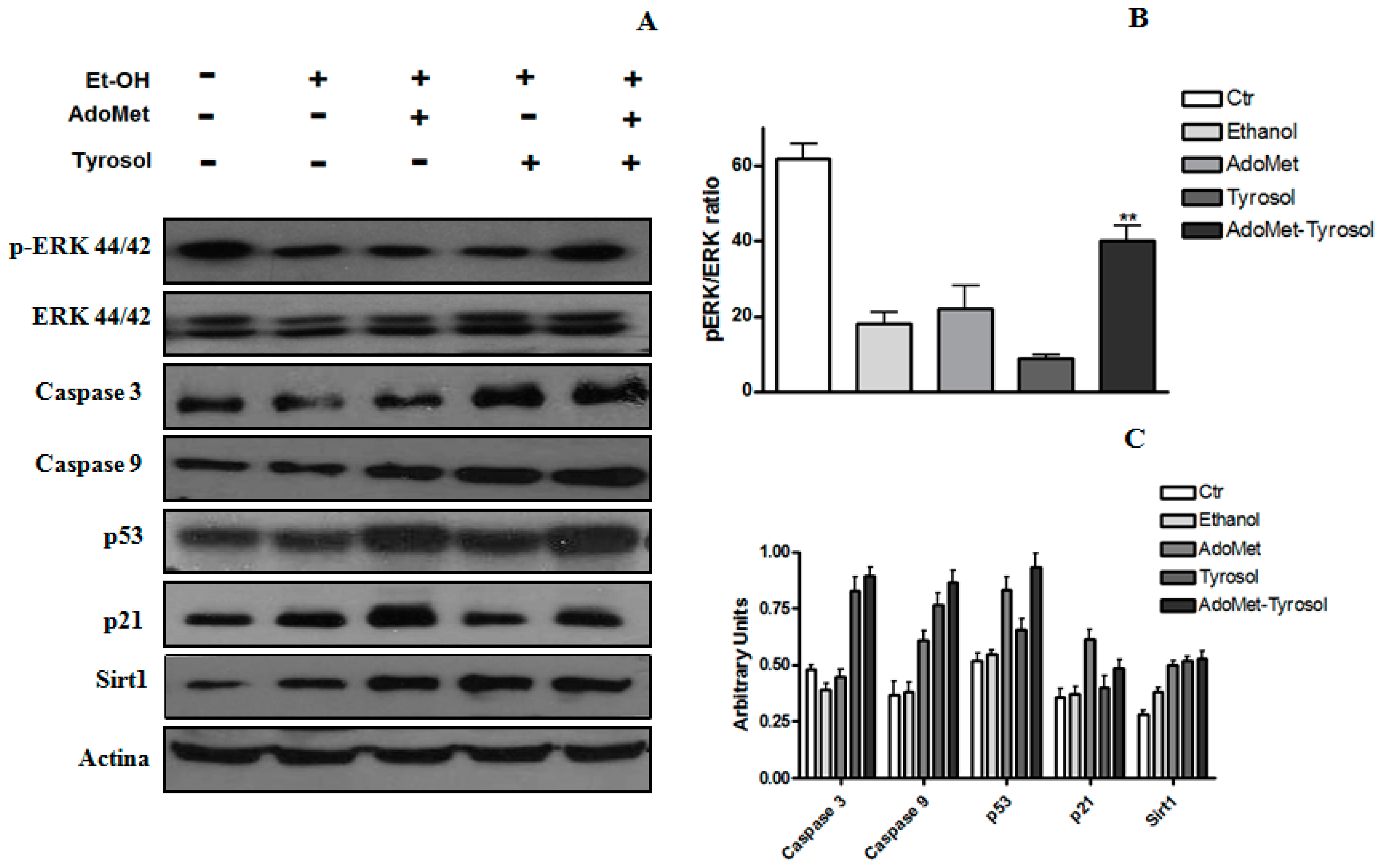 Figure 3. Effect of AdoMet, Tyr, and their combination on protein expression in HepG2 cells after acute ethanol treatment. The expression in cell lysates of SIRT1, Erk, p-Erk, caspase 3, caspase 9, p53, p21, and SIRT1 was assessed by Western-blot analysis using β-actin as an internal control (A); Densitometric quantitation of pERK/ERK ratio in different conditions (B); Densitometric quantification of SIRT1, caspase 3, caspase 9, p53, and p21 (C). Values represent the mean ± SD of three experiments. ** p < 0.01 was considered significant for ethanol alone.