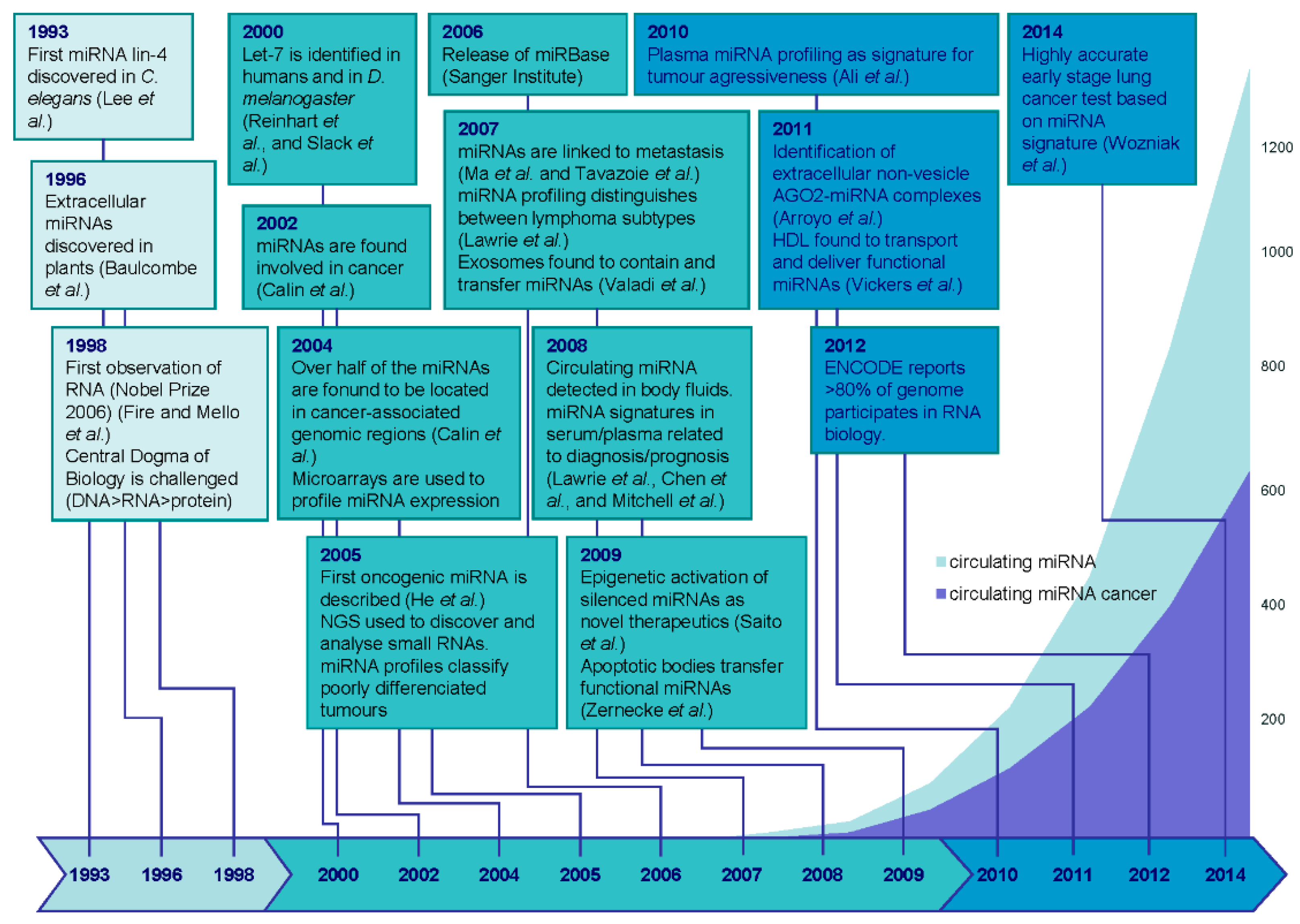 Chronological timeline of key discoveries in the microRNA (miRNA) field and their relevance to cancer. The overlapping plot depicts the number of PubMed-indexed publications for miRNA (dark blue) or miRNA related to cancer (light blue).