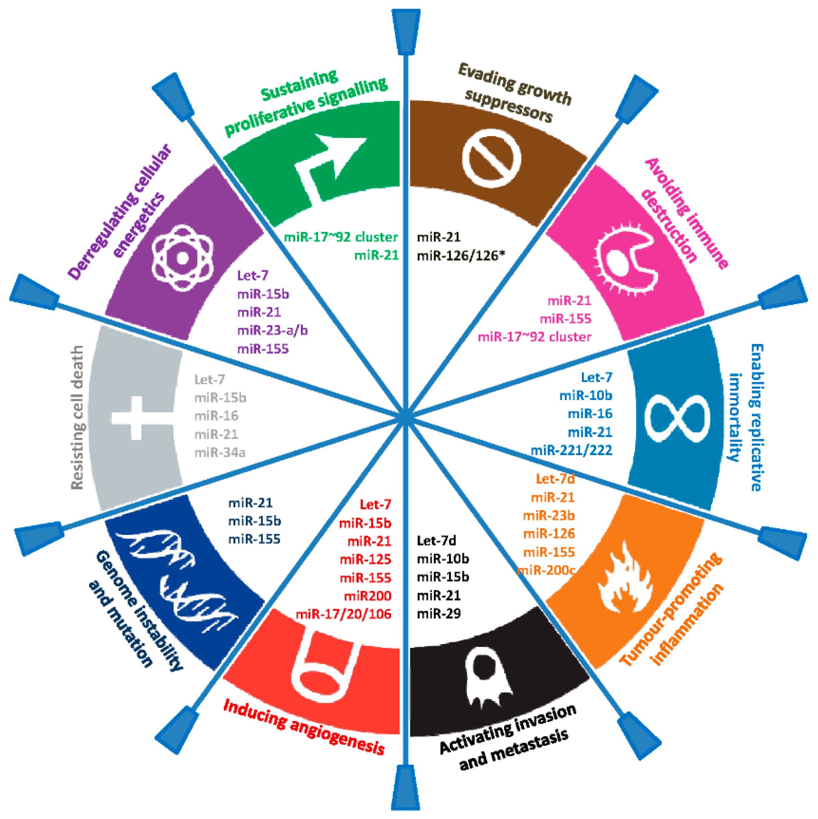 miRNAs are endogenous, small (18–24 nt), non-coding (nc) RNA molecules that regulate eukaryotic gene expression post-transcriptionally. miRNAs were unknown in science until just over 20 years ago, and, even then, were not formally recognized until 2001 [13]. There are now over 2500 human miRNAs that have been identified [14], and it is believed that nearly two thirds of all human genes are directly targeted by miRNAs [15]. miRNAs have been shown to play key regulatory roles in virtually every aspect of biology [16], including in the pathogenesis of cancer, and are aberrantly expressed in many diseases (Figure 1). Indeed, there is now compelling evidence that miRNAs regulate all aspects of the so-called “hallmarks of cancer” that enable tumor growth and metastatic dissemination [17,18] (Figure 2).