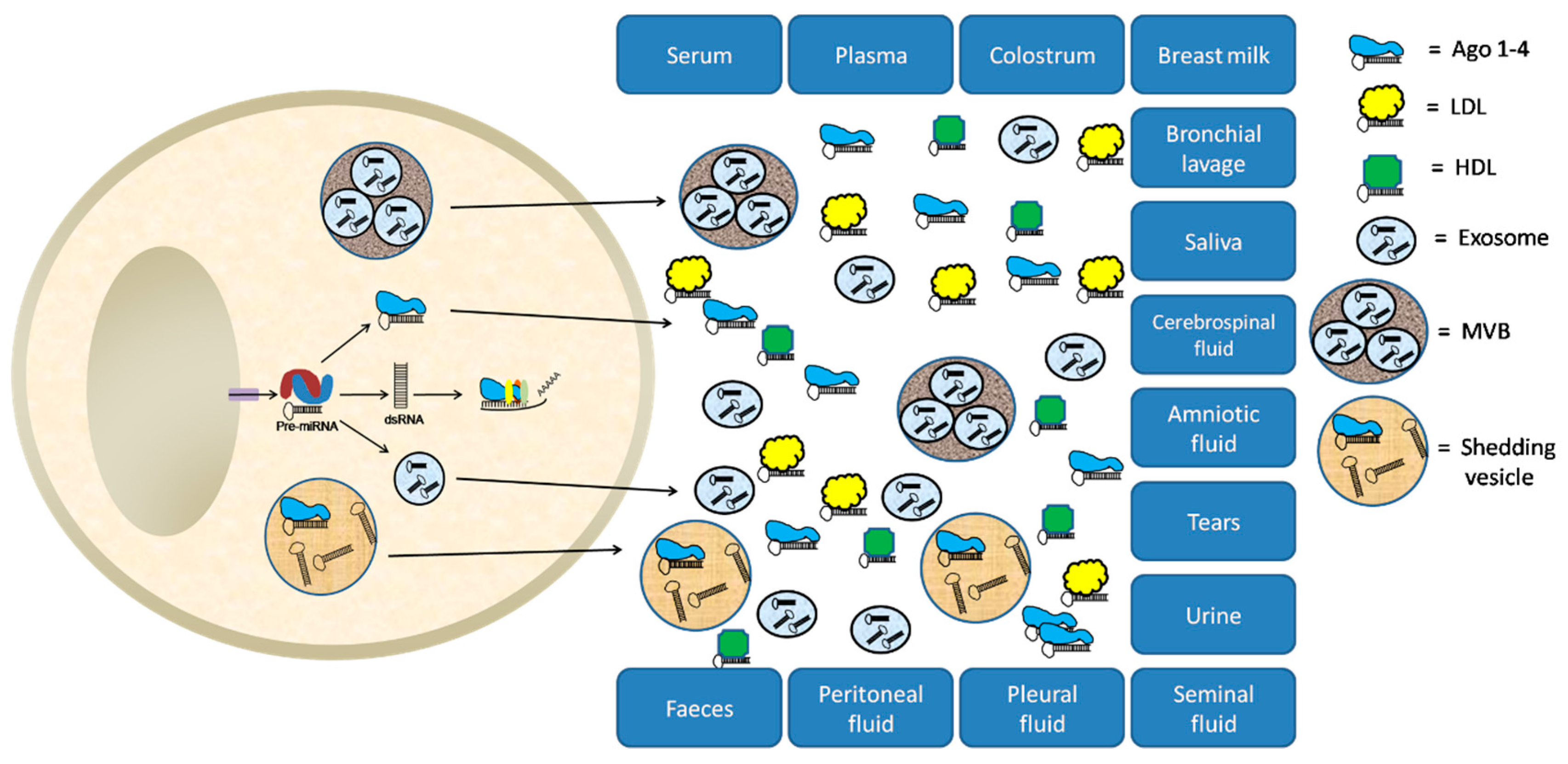 Origin of extracellular RNA. Several hypotheses have been proposed to explain the presence of miRNA in biological fluids, including the passive release of miRNA from broken cells and tissues and the active secretion from cells in microvesicles or conjugated to RNA-binding proteins. Cell-free miRNA can be detected in different body fluids including plasma, serum, saliva, tears, urine, amniotic fluid, colostrum, breast milk, bronchial lavage, cerebrospinal fluid, peritoneal fluid, pleural fluid, and seminal fluid and also in feces. Ago 1–4: Argonaute proteins 1–4; LDL: Low-density lipoprotein; HDL: High-density lipoprotein; MVB: Multivesicular body.