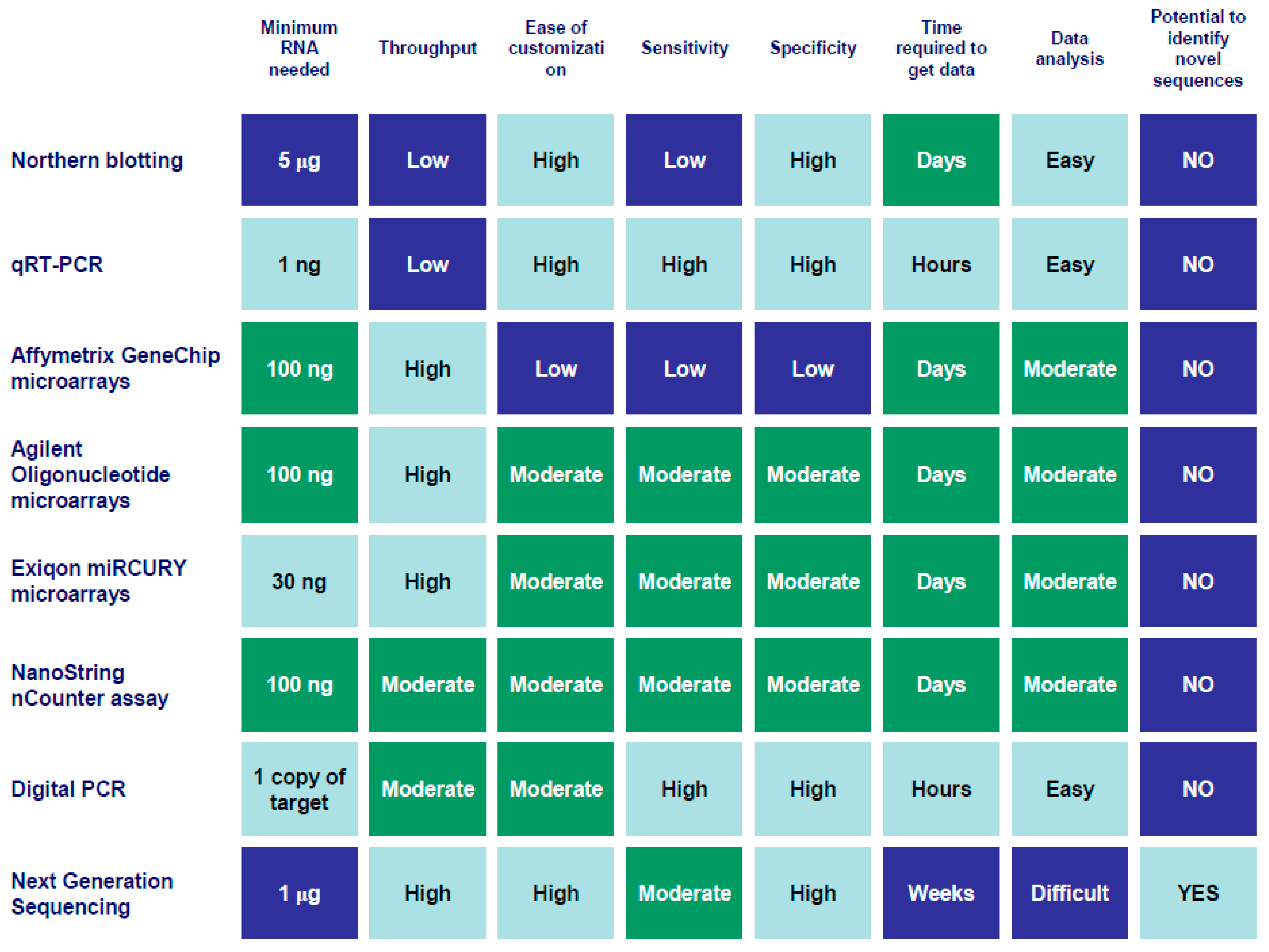 There are many different methods available to measure cfmiRNAs, including qRT-PCR (LNA-based, Taqman or other proprietary technologies), digital PCR (dPCR), microarrays, and next generation sequencing (NGS) techniques. The choice of platform depends largely on the experimental design required (Figure 4). Importantly, it should be borne in mind that the choice of technique can massively influence measurements; indeed, several studies show a lack of concordance between platforms when using the same sample source [454,455].