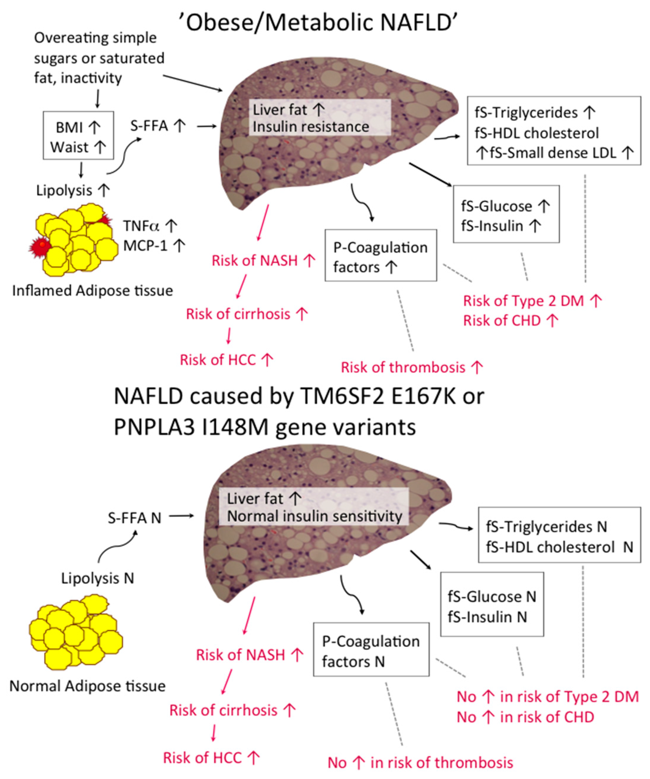 Schematic representation of causes and consequences of “Obese/Metabolic NAFLD” (top) and “TM6SF2 NAFLD” and “PNPLA3 NAFLD” (bottom). Abbreviations: BMI, body mass index; CHD, coronary heart disease; DM, diabetes mellitus; FFA, free fatty acids; fS, fasting serum; HCC, hepatocellular carcinoma; HDL, high density lipoprotein; MCP-1, monocyte chemoattractant protein-1; NAFLD, non-alcoholic fatty liver disease; NASH, non-alcoholic steatohepatits; LDL, low density lipoprotein; P, plasma; PNPLA3, patatin-like phospholipase domain-containing 3; S, serum; TM6SF2, transmembrane 6 superfamily member 2; TNF-α, tumor necrosis factor-α.
