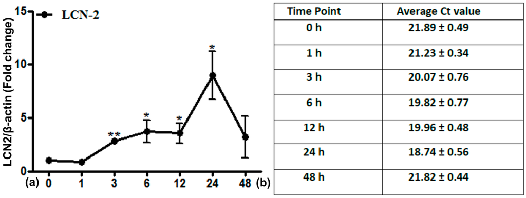 Fold change of mRNA expression of Lipocalin2 (LCN2) in irradiated lung tissue at time points from 1 to 48 h. Data are given relative to normal sham irradiated control rats (a). The results were normalized to the housekeeping gene β-actin, experimental errors are shown as ±SEM (* p ≤ 0.05, ** p ≤ 0.005, n = 3). Ct values are depicted in (b).