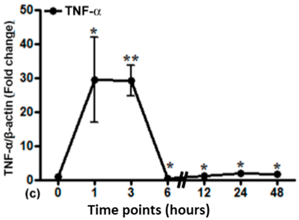 Relative mRNA expression of acute phase cytokines (IL-6 (a), IL-1β (b) and TNF-α (c)) in irradiated lung tissue. The results were normalized to β-actin as the housekeeping gene. Experimental errors are depicted as ±SEM (* p ≤ 0.05, ** p ≤ 0.005, n = 3).