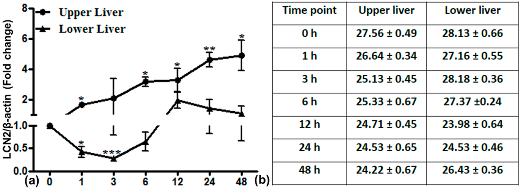 Relative mRNA expression of LCN2 in the upper and lower part of the liver after lung irradiation. Data are given relative to normal sham irradiated control rats (a). The results were normalized to β-actin as the housekeeping gene. Experimental errors are depicted as ±SEM (* p ≤ 0.05, ** p ≤ 0.005, *** p ≤ 0.0005, n = 3). Ct values are shown in (b).
