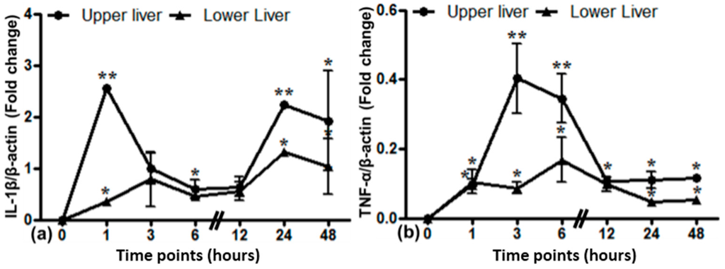 Relative mRNA expression of acute phase cytokines IL-1β (a) and TNF-α (b) in the upper and lower liver from the irradiated lung experiment. The results were normalized to β-actin as the housekeeping gene. Experimental errors are depicted as ±SEM (* p ≤ 0.05, ** p ≤ 0.005, n = 3).