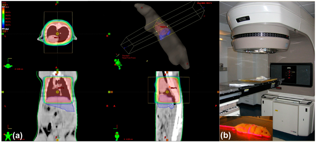 According to our previously-published model of single-dose irradiation [27], we here describe a lung irradiation model, where a single dose of 25 Gy was delivered to the lung using an antero-posterior/postero-anterior (AP/PA) radiation technique [26]. Exactly as in the previous protocol [26,27], dose distribution was calculated following a planning CT scan (Somatom Balance, Siemens, Erlangen, Germany). For this purpose, each rat was anesthetized intraperitoneally with 90 mg/kg ketamine (Intervet, Unterschleißheim, Germany) and 7.5 mg/kg xylazine 2% (Serumwerk Bernburg AG, Bernburg/Saale, Germany). The lung margins were drawn on the fur of the animals. An example for the dose distribution of lung x-radiation is given in Figure 10a. Irradiation of the targeted organ was then done at a dose rate of 2.4 Gy/min with 6 MV photons using a Varian Clinac 600 C accelerator (Varian, Palo Alto, CA, USA) (Figure 10b), resulting in a 25-Gy single dose. Because of the convex anatomy of the lung recesses, the upper portion of the liver was situated in the radiation field, whilst the lower portion of the liver remained outside (Figure 10). Sham irradiated rats served as controls.