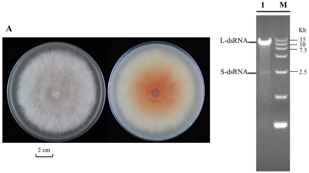 - Yu, L.; Sang, W.; Wu, M.D.; Zhang, J.; Yang, L.; Zhou, Y.J.; Chen, W.D.; Li, G.Q. Novel hypovirulence-associated RNA mycovirus in the plant-pathogenic fungus Botrytis cinerea: Molecular and biological characterization. Appl. Environ. Microbiol. 2015, 81, 2299–2310. [Google Scholar] [CrossRef] [PubMed]
