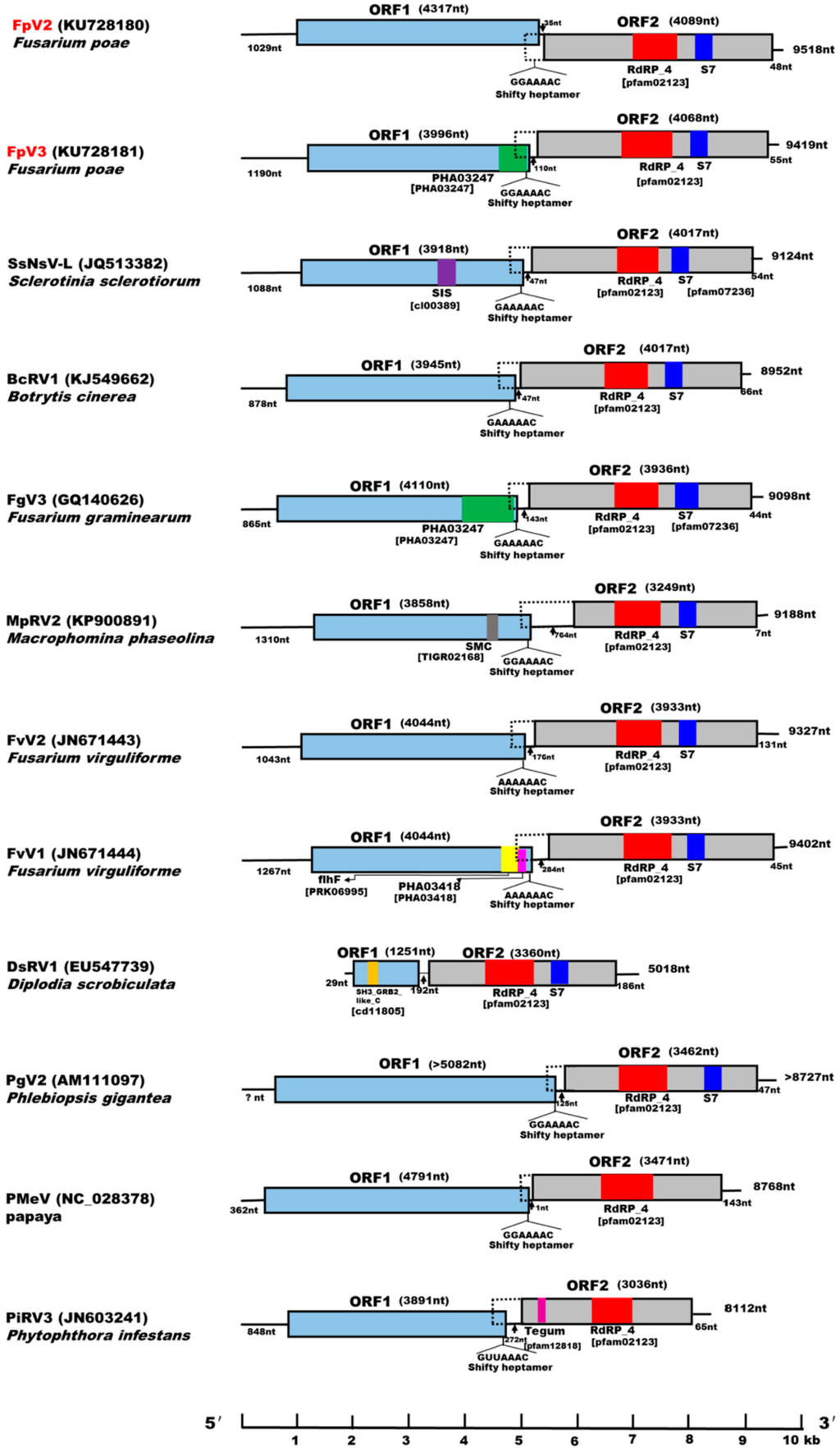 - Wang, S.; Kondo, H.; Liu, L.; Guo, L.; Qiu, D. A novel virus in the family Hypoviridae from the plant pathogenic fungus Fusarium graminearum. Virus Res. 2013, 174, 69–77. [Google Scholar] [CrossRef] [PubMed]