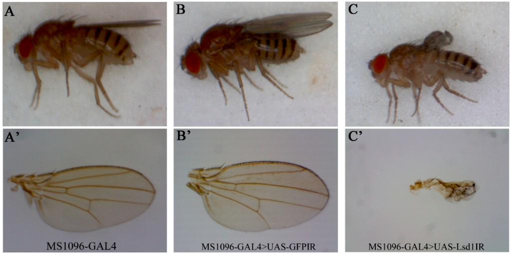 Although the function of Lsd1 in lipid metabolism is well known, its potential function in wing development has not been explored. We therefore focused on the analyses of the wing phenotype induced by Lsd1 knockdown. Flies carrying a single copy of the MS1096-GAL4 driver and UAS-Lsd1IR (MS1096-GAL4 > UAS-Lsd1IR) exhibited severe atrophied wing phenotypes, compared to control flies carrying one copy of MS1096-GAL4 only or flies carrying both MS1096-GAL4 and UAS-GFPIR (MS1096-GAL4 > UAS-GFPIR) (Figure 1). This effect may be caused by the disruption of the developmental processes of the wings.