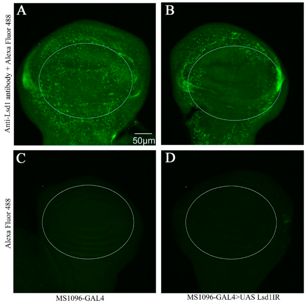 To confirm the effective knockdown of Lsd1 in the dorsal wing disc, we performed immunostaining of wing imaginal discs from third instar larvae using anti-Lsd1 antibody. The specificity of the anti-Lsd1 antibody we used has been fully characterized []. Lsd1-knockdown flies (MS1096-GAL4 > UAS-Lsd1IR) showed an extensive decrease of Lsd1 signals in the wing pouch of the wing imaginal disc (circled in Figure 2B). Control flies carrying MS1096-GAL4 alone showed strong Lsd1 signals in the wing pouch as well as other regions of the wing disc (Figure 2A). Immunostaining of wing imaginal discs of both MS1096-GAL4 and MS1096-GAL4 > UAS-Lsd1IR flies using only the secondary antibody showed no detectable signal in wing discs (Figure 2C,D). These results confirmed the effective knockdown of Lsd1 in the wing disc of MS1096-GAL4 > UAS-Lsd1IR flies, which very likely resulted in the atrophied wing phenotype.