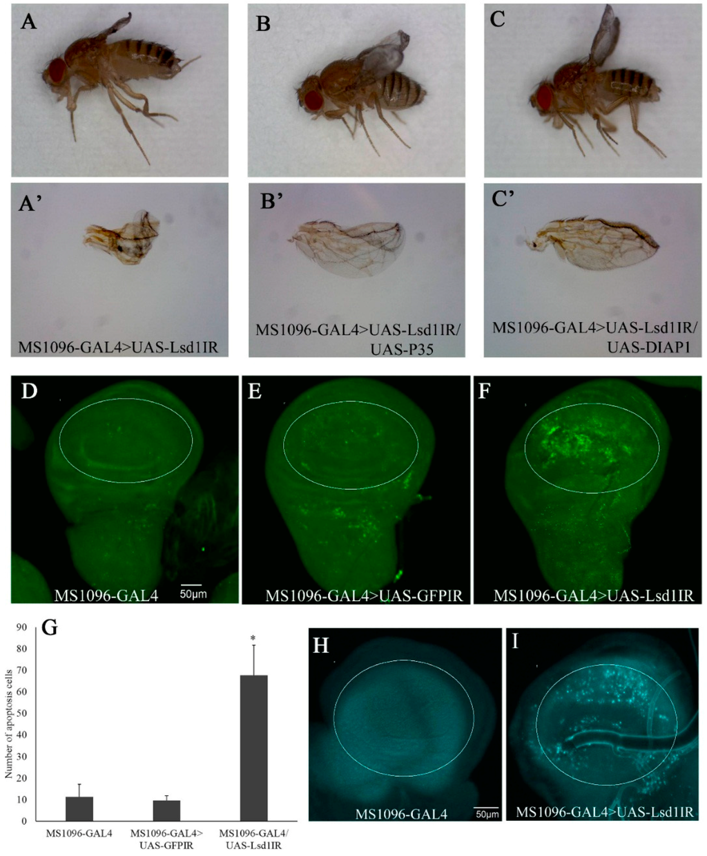 The atrophied wings of Lsd1-knockdown flies suggested the possible involvement of apoptotic and/or autophagy processes. In Drosophila, baculoviral P35 and DIAP1 (Death-associated inhibitor of apoptosis 1) have been shown to effectively inhibit apoptosis when ectopically expressed []. Lsd1-knockdown flies were crossed with the flies carrying UAS-P35 or UAS-DIAP1. The atrophied wing phenotype induced by Lsd1-knockdown (Figure 3A,A’) was effectively suppressed by wing specific expression of P35 (Figure 3B,B’) or DIAP1 (Figure 3C,C’). These data suggest that atrophied wing phenotype induced by Lsd1-knockdown is at least partially due to apoptosis in wing imaginal discs. Therefore, wing discs from third instar larvae of Lsd1-knockdown and control flies were immunostained with anti-cleaved caspase-3 IgG to detect caspase-dependent apoptotic cells. The wing pouch compartment of the wing imaginal disc of Lsd1-knockdown flies (MS1096-GAL4 > UAS-Lsd1IR) showed an increase in apoptotic cells compared with the control (Figure 3D–F). As shown in Figure 3G, the difference in the number of apoptotic cells in the wing pouches of Lsd1-knockdown flies and control flies was statistically significant (p < 0.05, Student’s t test). These results indicate that knockdown of Lsd1 in the wing disc induces apoptosis.