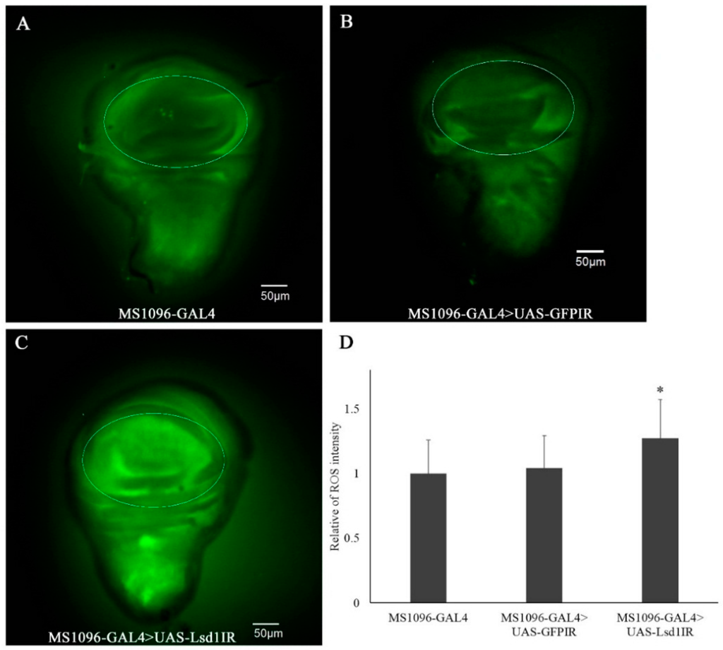 Knockdown of Lsd1 induces ectopic ROS in wing imaginal discs. Wing discs of third-instar larvae were incubated with substrate CM-H2DCFDA. The control lines MS1096-GAL4 (A) and MS1096-GAL4 > UAS-GFPIR (B) showed an unclear ROS signal in the wing disc (marked by the circle), while the Lsd1-knockdown line (MS1096-GAL4 > UAS-Lsd1IR) showed an increased ROS signal (C); (D) Quantification of fluorescent ROS signals in the wing pouch region. Mean intensities with standard deviation from six imaginal discs are shown; * p < 0.05, Student’s t test.