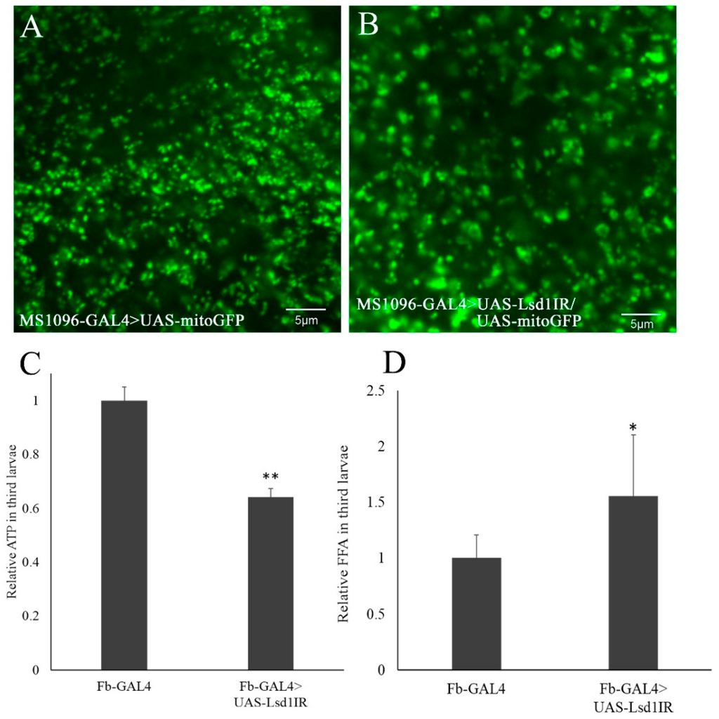 Knockdown of Lsd1 induces mitochondrial expansion and defects in ATP and free fatty acids (FFA) production. (A,B) The green fluorescent protein (GFP) signal expressed in mitochondria of wing disc cells were observed under BX-50 fluorescence microscopy. The control flies MS1096-GAL4/+; +; UAS-MitoGFP/+ (MS1096-GAL4 > UAS-MitoGFP) showed normal mitochondrial matrix (A); while the Lsd1-knockdown flies MS1096-GAL4/+; UAS-Lsd1IR/+; UAS-MitoGFP/+ (MS1096-GAL4 > UAS-Lsd1IR/UAS-MitoGFP) appeared to exhibit mitochondrial expansion (B); Relative amounts of ATP (C) and FFA (D) of Lsd1-knockdown flies yw; Fb-GAL4/UAS-Lsd1IR; + (Fb-GAL4 > UAS-Lsd1IR). ATP and FFA amounts in whole bodies of third instar larvae were normalized to body weight. The experiments were repeated at least three times. * p < 0.05, ** p < 0.001, Student’s t test. The flies were reared at 25 °C.