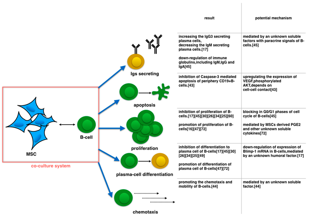 When MSCs are co-cultured with B-cells in basic condition, MSCs regulate Igs-secreting, apoptosis, proliferation, plasma-cell differentiation and chemotaxis of B-cells. For indefinite reasons, such as diverse stimulators of B-cells in culture medium, regulations of proliferation, plasma-cell differentiation and Igs secreting of B-cells are unable to reach agreement.