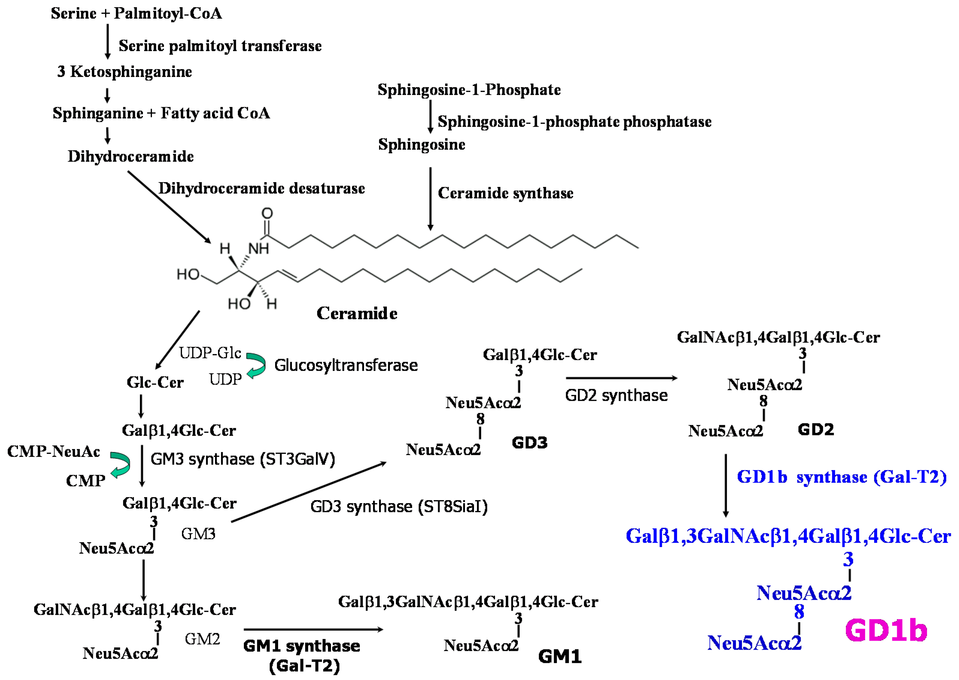Structures of gangliosides and biosynthetic pathway of disialo GD1b.