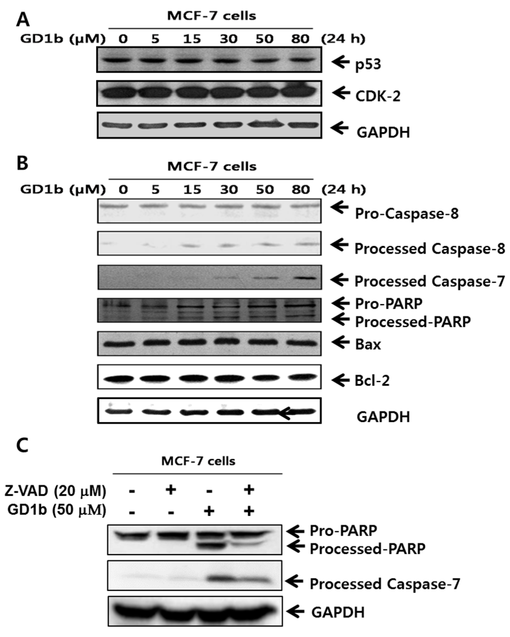 Effects of GD1b treatment on cell cycle arrest and apoptosis. The lysates containing equal protein content were separated by SDS-PAGE and analyzed by western blotting. Expression of cell cycle arrest- (A) and apoptosis- (B) related molecules were examined of protein extracts of MCF-7 cells treated without (negative control with methanol) or with various concentrations of GD1b for 24 h. MCF-7 cells were treated with 50 µM GD1b for 24 h in the presence or absence of 20 µM Z-VAD and then analyzed by immunoblotting (C) with antibody PARP and capase-7. GAPDH was used as the internal control.
