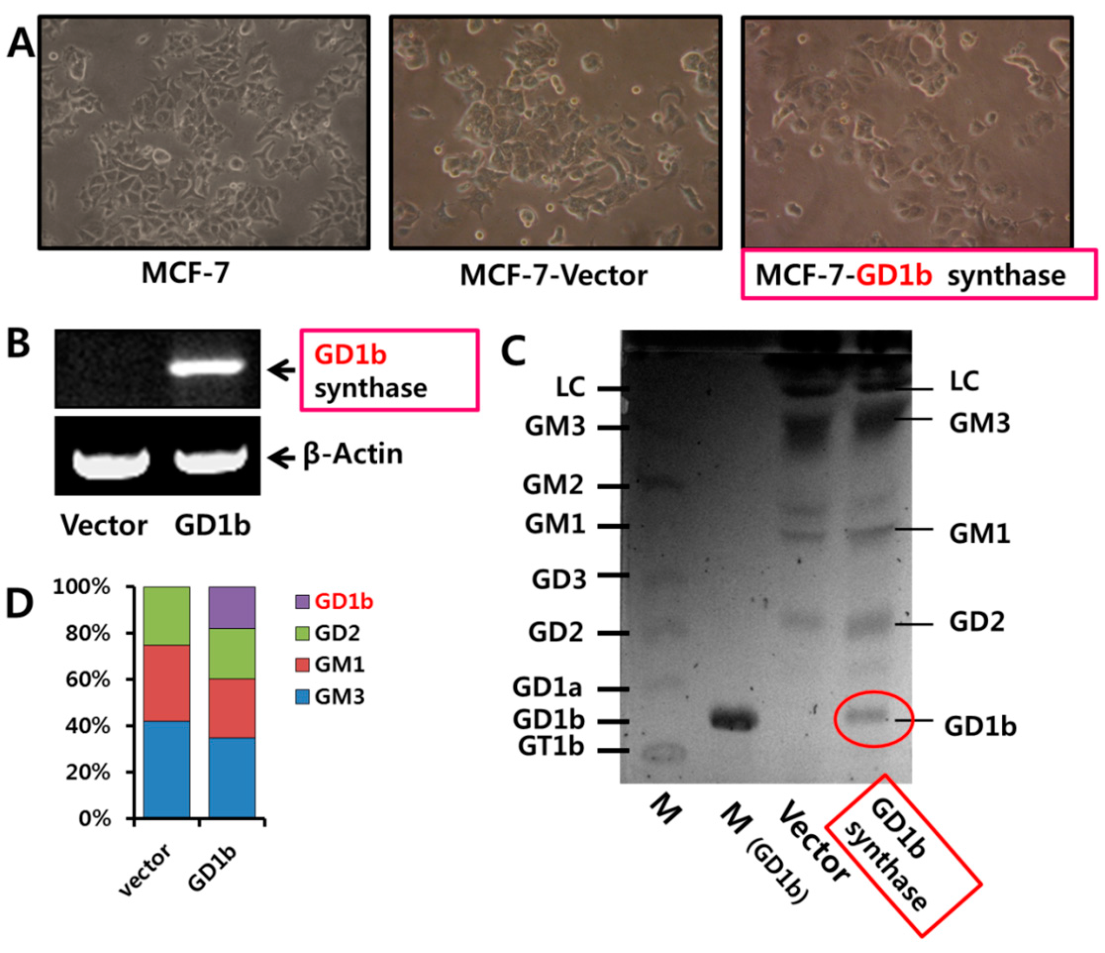 Establishment of GD1b synthase-transfected MCF-7 cell line. (A) Effect of GD1b synthase transfection on MCF-7 cells morphological changes. Morphological changes of MCF-7, vector- (pcDNA 3.1 vector) and GD1b (pcDNA 3.1 vector/GD1b synthase)-transfectant cells were observed under a phase-contrast microscope with 100×; (B) Expression levels of GD1b synthase of vector- and GD1b-transfectant cells were analyzed by RT-PCR. β-Actin was used as the internal control; (C) Gangliosides contents in vector- and GD1b-trnasfectant cells were analyzed by TLC; (D) Comparison of ganglioside contents in Mock (vector-transfected) MCF-7 cells and GD1b synthase-transfected MCF-7 cells. Percentage of each ganglioside was measured by densitometry with total gangliosides of each lane as 100%.