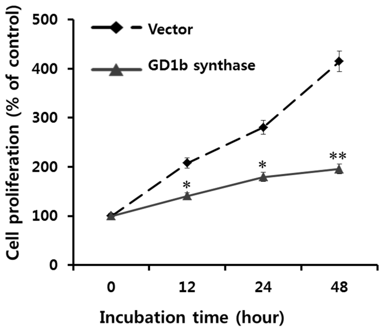 Effects of GD1b overexpression on the cell growth. The growth of vector- and GD1b-transfectant cells was evaluated using an XTT cell proliferation assay kit. Vector- and GD1b-transfectant cells were serum (+) incubated for 0, 12, 24 and 48 h. All data are reported as the percentage change in comparison with the control group, which were arbitrarily assigned 100% viability. Data represent five experiments (means ± sd). * p < 0.01 and ** p < 0.001 vs. vector (mock) transfectants, at each incubation time.