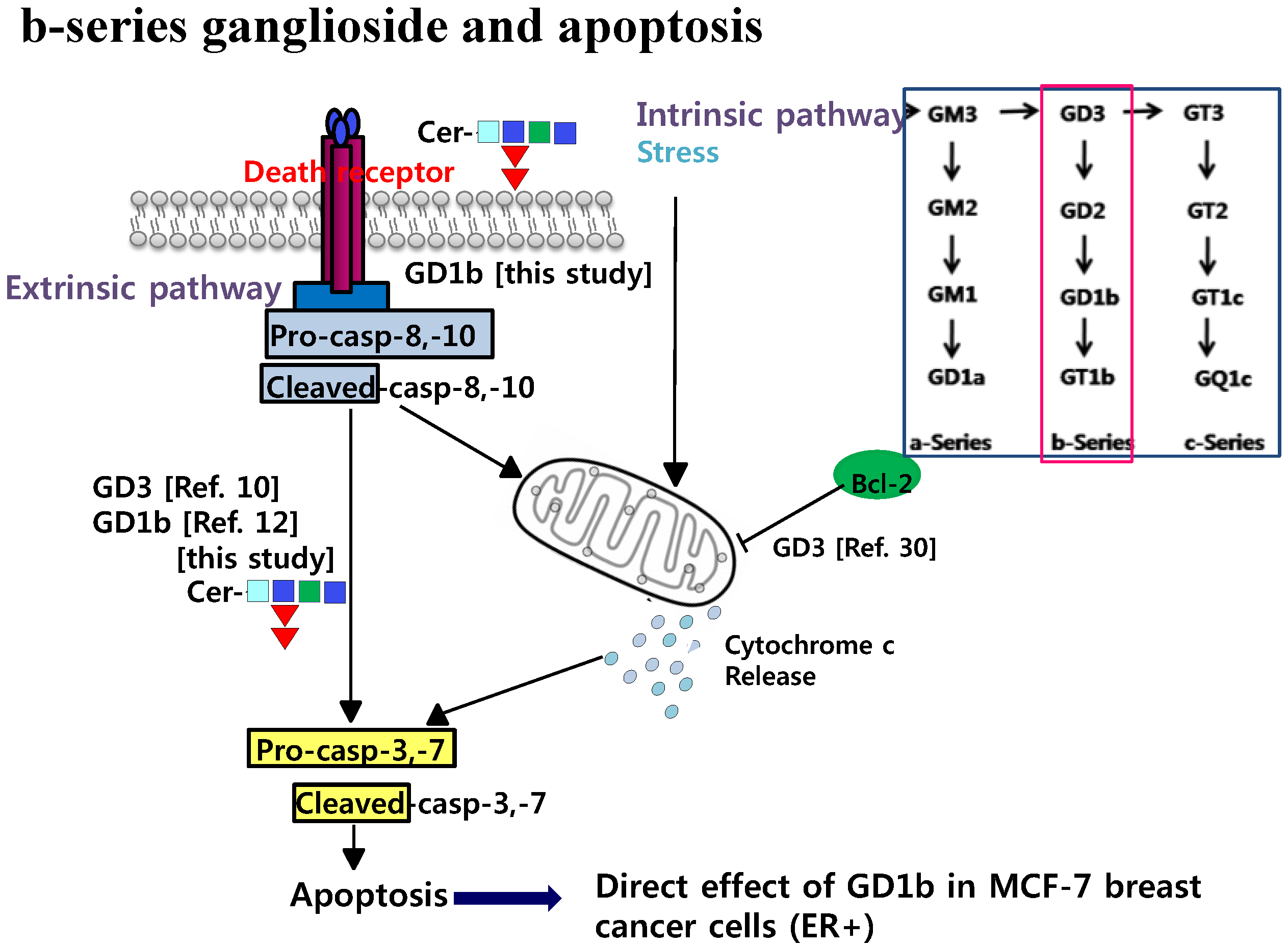 Schematic illustration of b-series gangliosides such as GD1b and GD3 for the apoptotic activities in breast cancer cells. The red square indicates b-series ganglioside during biosynthesis.