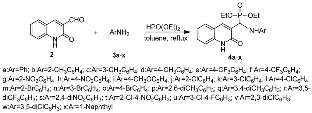 Fang Y-L, Wu Z-L, Xiao M-W, Tang Y-T, Li K-M, Ye J, Xiang J-N, Hu A-X. One-Pot Three-Component Synthesis of Novel Diethyl((2-oxo-1,2-dihydroquinolin-3-yl)(arylamino)methyl)phosphonate as Potential Anticancer Agents. International Journal of Molecular Sciences. 2016; 17(5):653. https://doi.org/10.3390/ijms17050653