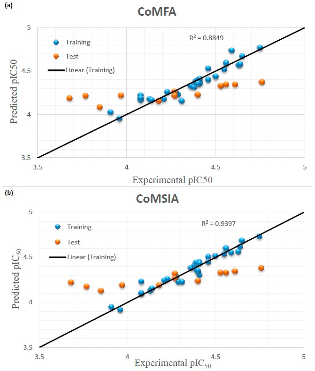 Graphical interpretation of experimental vs. predicted pIC50 of compounds 1–44 developed by CoMFA (a) and CoMSIA (b) models.