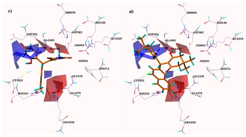 The most active compounds 4i and 5l were superimposed on the CoMFA contours. Two large blue contour maps were found around the pyrimidine ring of compound 4i (Figure 3a,c) suggesting the existence of an electron donating group at this position is required to interact with modified lysine KCX219 and Gly279 residue. In the case of least active compounds 4s-4t, 5f-5g, 5i, and 5s this pyridine ring is replaced by cyclohexenone ring and does not interact with modified lysine KCX219 and Gly279, which significantly lessened the activities of these compounds. Two red contour maps found on the pyrimidine rings near the carbonyl and hydroxyl substituent were representing that the electronegative substitution at this position is suitable for improving its biological activity. These electronegative (EN) moieties interact with NH moiety of catalytic residues (Ala169, Gly279, and Asp362) in protein. Any loss of EN moieties at this position considerably decreases the activity. Another red contour present near the benzene ring of most active compound indicating that any electronegative substitution at this position can enhance the activity. In the least active compounds 4t, 5g, and 5i (Figure 3b,d) carbonyl oxygen is replaced by a different alkyl group, revealing the lesser activities of these compounds.
