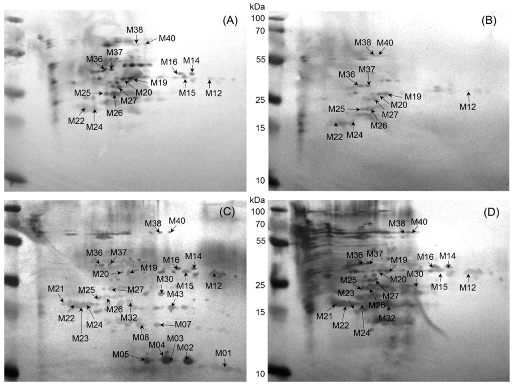 Representative 2D-PAGE immunoblotting images of whole cell proteins from B. melitensis field strain extracts separated on a 12% polyacrylamide gel. The blot was developed using the TMB kit after immuno-blotting with serum from (A) cattle; (B) buffalo; (C) sheep; and (D) goat and the respective peroxidase-conjugated secondary antibodies.