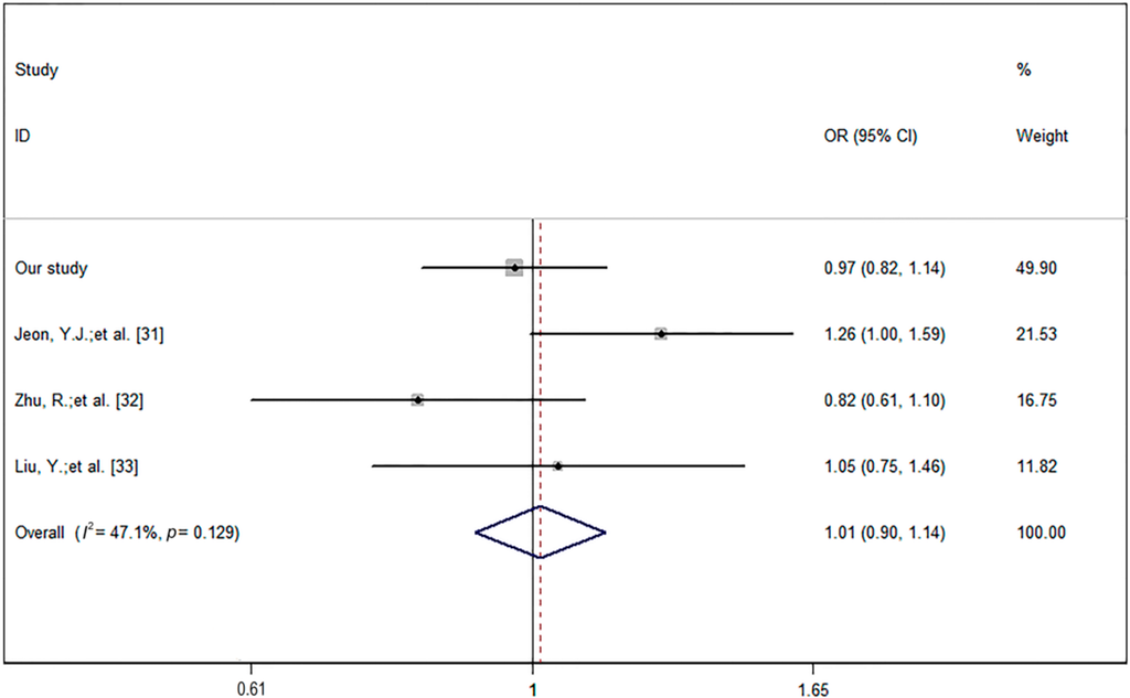 A forest plot was constructed from the findings of four studies showing the relationship between rs2910164 and ischemic stroke in Asian populations under the dominant model (genotype (GG + CG) vs. CC) (Figure 1). This suggested that rs2910164 does not affect the ischemic stroke incidence (OR = 1.01, 95% CI = 0.90–1.14).