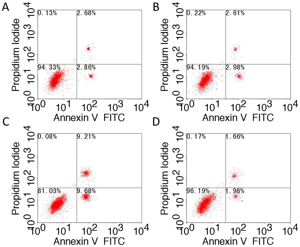 HepG2 cells that were transfected with siRNA-TM4SF1, TM4SF1-expressing plasmids, and blank vectors and HepG2 cells without transfection were subjected to Annexin V-FITC/PI staining according to the manufacturer’s instructions. After washing in PBS, cells were re-suspended in binding buffer and cell density was adjusted to 5 × 105/mL. Then, 195 μL of cell suspension was mixed with 5 μL of Annexin V-FITC, followed by incubation at room temperature for 10 min. After one wash in PBS, cells were re-suspended in 190 μL of binding buffer, followed by addition of 10 μL of 20 µg/mL propidium iodide. Finally, cells were washed and then analyzed using a flow cytometer. Percentage of apototosis cells (%) = (number of Annexin V+PI− and Annexin V+PI+ cells)/total cells × 100%.