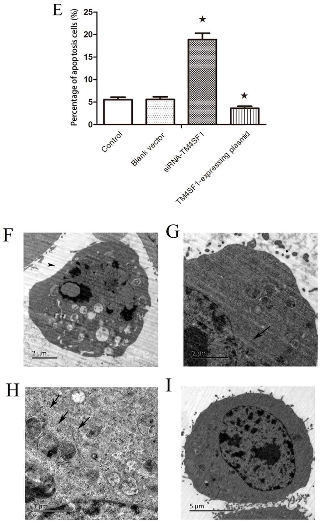 TM4SF1 gene knockdown led to increased apoptosis and autophagy of HepG2 cells while TM4SF1 overexpression reduced the apoptosis of cells. HepG2 cells were not transfected (A); transfected with blank vectors (B); transfected with siRNA-TM4SF1 (C); or transfected with TM4SF1-expressing plasmids (D) and then harvested and processed for measurement of apoptosis by flow cytometry (E). Transmission electron microscopy was used to determine apoptosis and autophagy of HepG2 cells without transfection (F); transfected with blank vectors (G); transfected with siRNA-TM4SF1 (H); or transfected with TM4SF1-expressing plasmids (I). Arrowhead, karyokinesis; Arrow, autophagosomes. Experiments were performed 3 times and similar findings were observed. ★ p < 0.01 vs. non-transfected HepG2 cells.