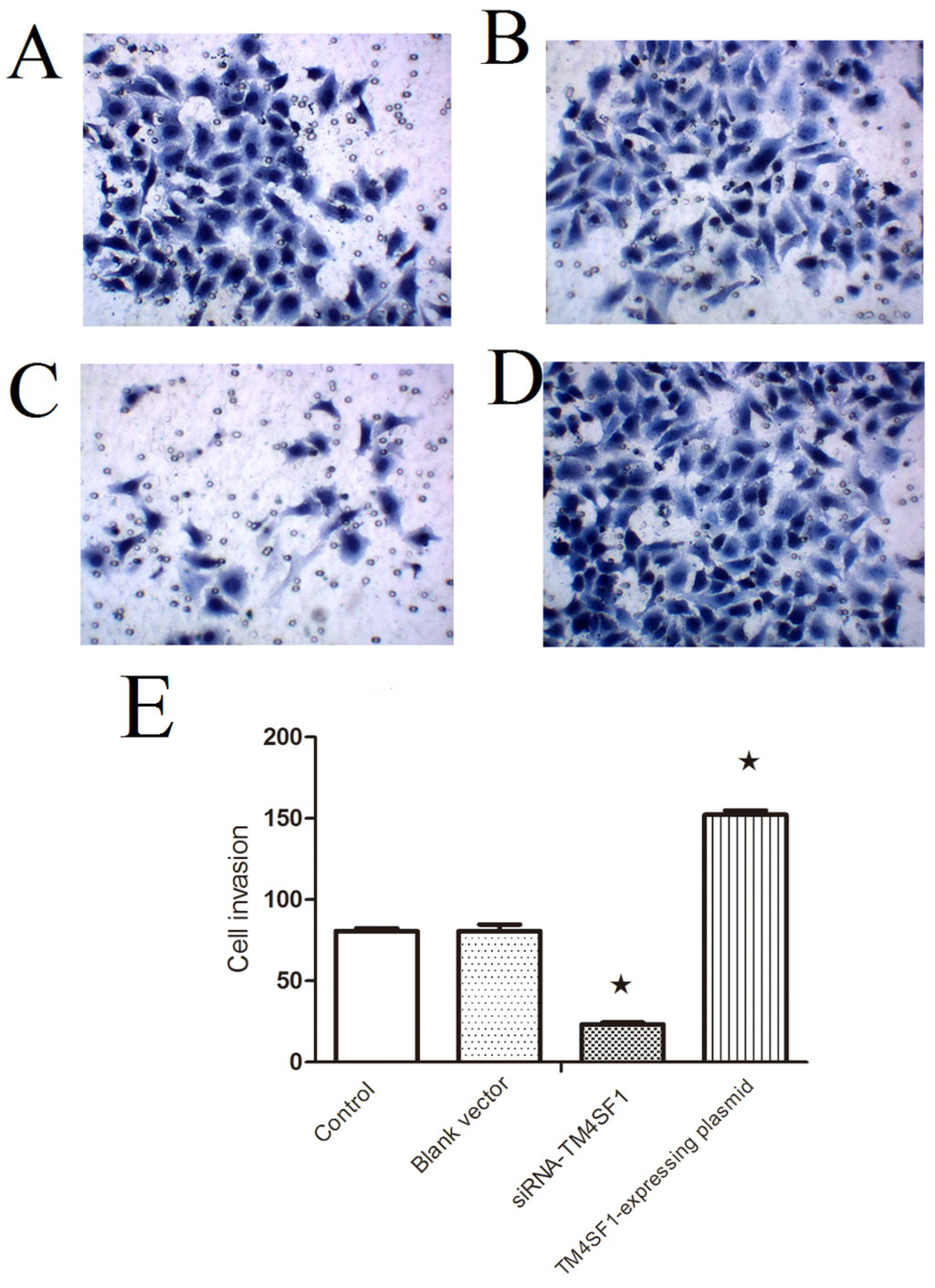 TM4SF1 gene knockdown led to reduce the migration of HepG2 cells and TM4SF1 overexpression increased migration of cells. Cells without transfection (A); transfected with blank vectors (B); transfected with siRNA-TM4SF1 (C); or transfected with TM4SF1-expressing plasmids (D) were harvested and seeded into Transwell chambers (5 × 105 cells/chamber) for evaluation of migration (E) under an inverted microscope (200×) for identification of hematoxylin-positive cells. The experiment was performed four times. ★ p < 0.01 vs. non-transfected HepG2 cells.