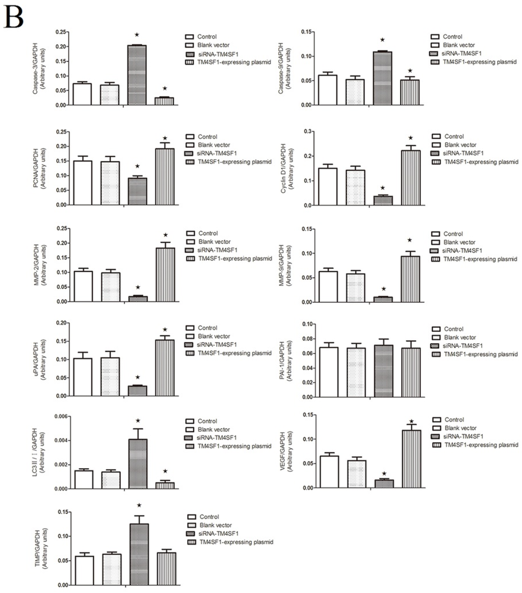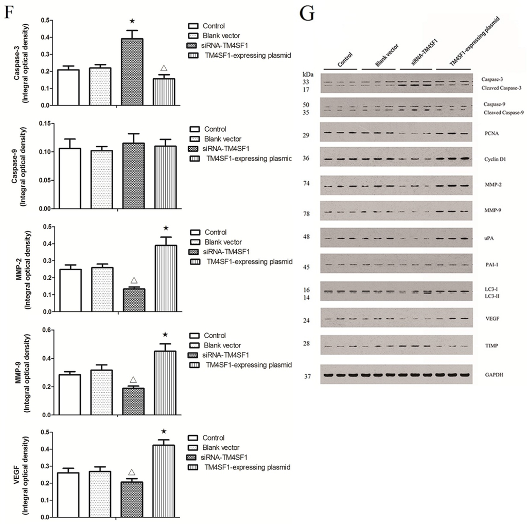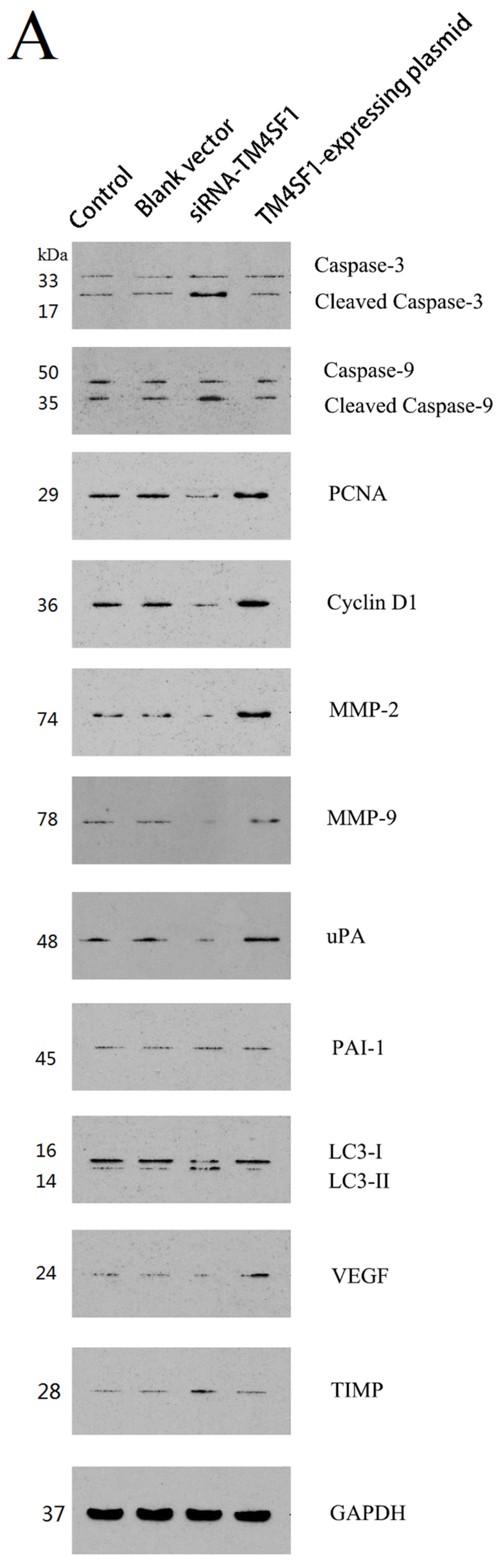 HepG2 cells transfected with siRNA-TM4SF1, TM4SF1-expressing plasmids, blank vectors and cells without transfection, and the transplanted tumors of nude mice were harvested. Total protein was extracted from cells and tissues for measurement of protein expression. Cell extracts were prepared using a lysis buffer containing 20 mM HEPES (pH 7.4), 0.5% Triton X-100, 150 mM NaCl, 12.5 mM β-glycerophosphate, 50 mM NaF, 1 mM DTT, 1 mM sodium orthovanadate, 2 mM EDTA, 1 mM PMSF, and protease inhibitor cocktail (Roche Applied Science, Indianapolis, IN, USA). Protein concentration of cell extracts was determined by the Bradford protein reagent (Bio-Rad), using BSA as a standard. Equal amounts of cell extracts were resuspended in Laemmli loading buffer (Bio-Rad), boiled and subjected to SDS-polyacrylamide gel electrophoresis to separate proteins on 4%–20% polyacrylamide minigels (Invitrogen). Proteins were electrotransferred to Immobilon-P membranes (Millipore, Billerica, MA, USA), membranes were blocked with Tris-buffered solution (TBS) with 0.1% Tween 20 (TBS-T), containing 5% non-fat dry milk (Bio-Rad), and probed for 20 h at 4 °C with the corresponding primary antibodies, such as the monoclonal antibody against TM4SF1, caspase-3, caspase-9, PCNA, cyclin D1, MMP-2, MMP-9, uPA, PAI-1, LC3, VEGF, TIMP and GAPDH. After washing five times in TBS-T, membranes were incubated with the corresponding anti-rabbit, anti-mouse, or anti-goat secondary IgG-HRP conjugates diluted at 1:12,000 in TBS-T/5% milk, before being washed three times; bands were revealed by incubation with enhanced chemiluminescence reagents (ECL+) followed by exposure to X-ray films. Densitometric analysis of intensities of the protein bands from three independent experiments was performed using the Quantity One software (Bio-Rad). Levels of TM4SF1, caspase-3, caspase-9, PCNA, cyclin D1, MMP-2, MMP-9, uPA, PAI-1, LC3, VEGF, and TIMP were normalized to those of GAPDH, and data were expressed as arbitrary units.