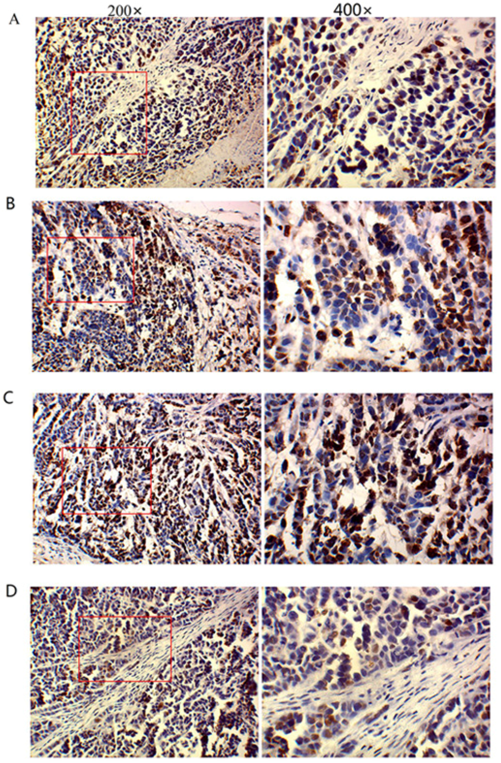 Immunohistochemistry was performed according to manufacturer’s instructions by use of the SP method (UltraSensitive TM-SP). In brief, sections were routinely deparaffinized and treated with methanol that contained 3% hydrogen peroxide for 30 min. Then, sections were blocked in normal serum (50 μL/section) for 10 min at room temperature, and incubated with the primary antibody (caspase-3, caspase-9, MMP-2, MMP-9 and VEGF) or PBS (negative control) at 4 °C overnight. After incubation with biotin-conjugated secondary antibody (50 μL/section) for 10 min at room temperature, 50 μL of streptavidin-peroxidase was added, followed by incubation at room temperature for 10 min. Sections were then treated with freshly prepared DAB solution for 3−10 min depending on the staining intensity (observed by microscopy). Sections were washed three times in PBS (3 min each) between steps. After staining, sections were counterstained with hematoxylin for 2 min and then treated with ethanol in HCl. Sections were washed in water, dehydrated in ethanol, transparentized in xylene, mounted with neutral gum, and observed under a light microscope. Positive cells had yellow-brown granules in the cytoplasm. Endothelial cells with yellow-brown granules in the cytoplasm were VEGF-positive cells; non-endothelial cells with yellow-brown granules in the cytoplasm were caspase-9- or MMP-2-positive cells, and monocytes with yellow-brown granules were positive for caspase-3. The IOD values for caspase-3, caspase-9, MMP-2, MMP-9, and VEGF cells were determined independently.