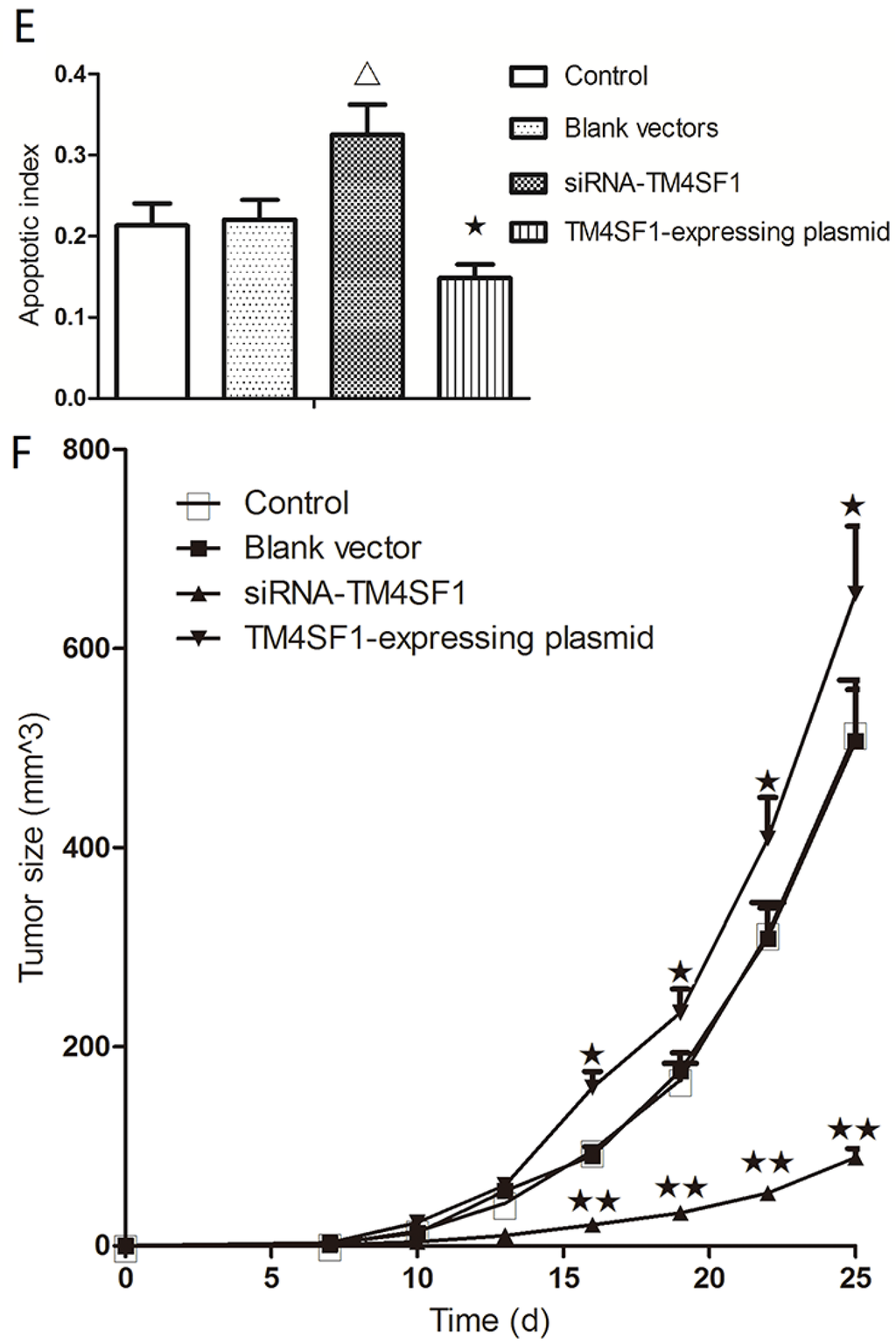 TM4SF1 regulates tumor growth in vivo by modulating cell apoptosis. HepG2 cells that were not transfected (A); or transfected with blank vectors (B); siRNA-TM4SF1 (C); or TM4SF1-expressing plasmids (D) were harvested and inoculated into nude mice; and the apoptotic index (E) and tumor size were measured (F). Tumor volume was calculated as: (maximum diameter) × (minimum diameter)2 × 0.52. Δ p < 0.01 vs. non-transfected HepG2 cells; ★ p < 0.01 vs. non-transfected HepG2 cells; ★★ p < 0.001 vs. non-transfected HepG2 cells.