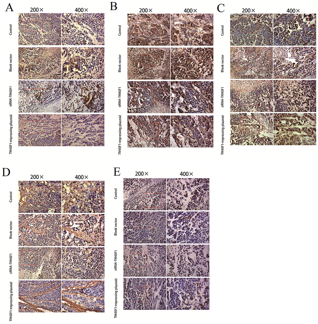 To determine the molecular mechanism of how TM4SF1 regulates tumor growth, we focused on the cell apoptosis; it is well known that decreased susceptibility to apoptosis plays an important role in tumor growth [9]. Transfection with siRNA-TM4SF1 significantly reduced the number of cells relative to controls and transfection with TM4SF1-expressing plasmids increased the number of cells relative to controls (Figure S3). Nude mice were given subcutaneous injection of HepG2 cells without transfection (Figure 4A), or transfected with blank vectors (Figure 4B), siRNA-TM4SF1 (Figure 4C), or TM4SF1-expressing plasmids (Figure 4D). As shown in Figure 4E, HepG2 cells with TM4SF1 overexpression showed less cell apoptosis (based on TUNEL staining) than injection with control cells at 25 days (p < 0.01). Injection with HepG2 cells transfected with siRNA-TM4SF1 led to greater cell apoptosis than injection with control cells at 25 days (p < 0.01). Subcutaneous injection of nude mice with HepG2 cells that were transfected with TM4SF1-expressing plasmids led to significantly larger tumors than injection with control cells on day 16, 19, 22, and 25 (p < 0.01 for all comparisons). Injection with HepG2 cells transfected with siRNA-TM4SF1 led to significantly smaller tumors than injection with control cells at day 16, 19, 22, and 25 (p < 0.001 for all comparisons) (Figure 4F).
